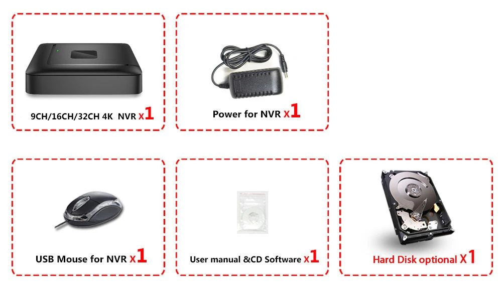 Сетевой видеорегистратор 1X4K 9CH/16CH/32CH NVR;1 х мощность для NVR;1 х USB мышь для NVR;1 компакт-диск программного обеспечения для NVR;Жесткий диск опционально!