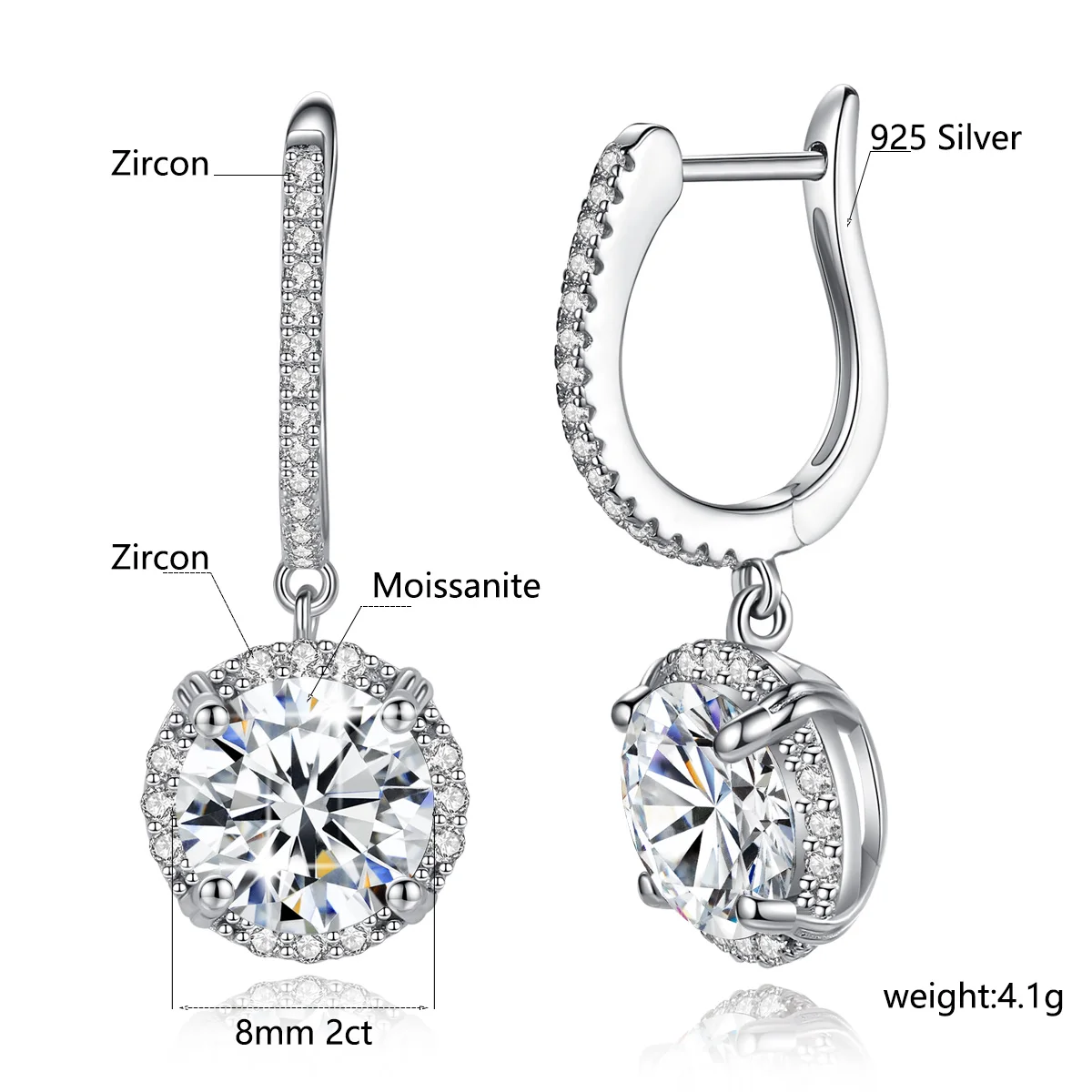 Основной камень: 2 шт. моиссанитовБоковой камень: AAA + фианитРазмер моиссанита: 8 ммMoissanite Вес: 2ct (всего 4ct)Моиссанит ясность: VVS1Moissanite Цвет: D ЦветФорма камня: круглаяМетод Создания камня: лабораторияТип металла: Настоящее 925 пробы серебро + покрытие из белого золотаЦвет металла: белый золотойСертификат: GRA сертификат