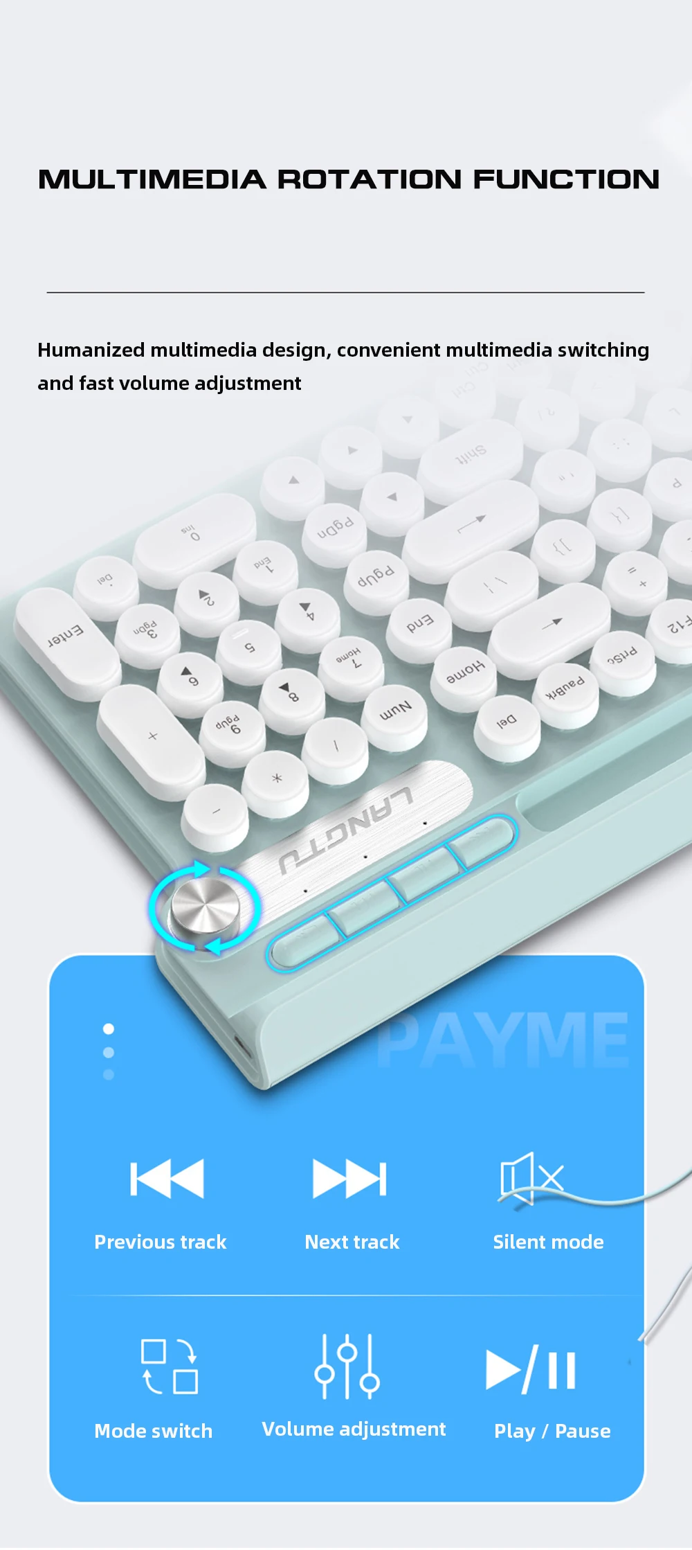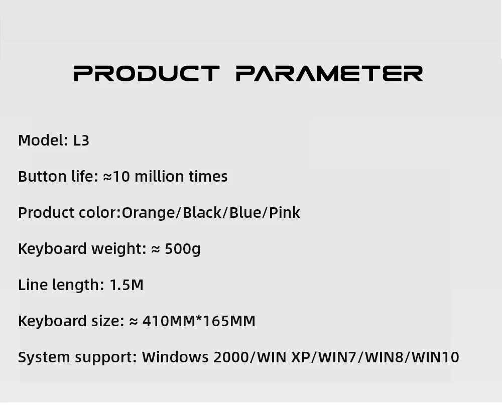 Спецификация:Тип: LANGTU-L3 Проводная Бесшумная клавиатураКоличество клавиш: 102 клавишиСпособ подключения: USBЦвет: черный/розовый/белыйВес: ≈ 500 гДлина шнура: 1,5 мМатериал: АБС-пластикСрок службы кнопки: ≥ 10 миллионов разРазмер: ≥ 410 мм * 165 ммПоддержка системы: Windows 2000/WIN XP/WIN7/WIN8/WIN10Упаковочный лист:1x клавиатура