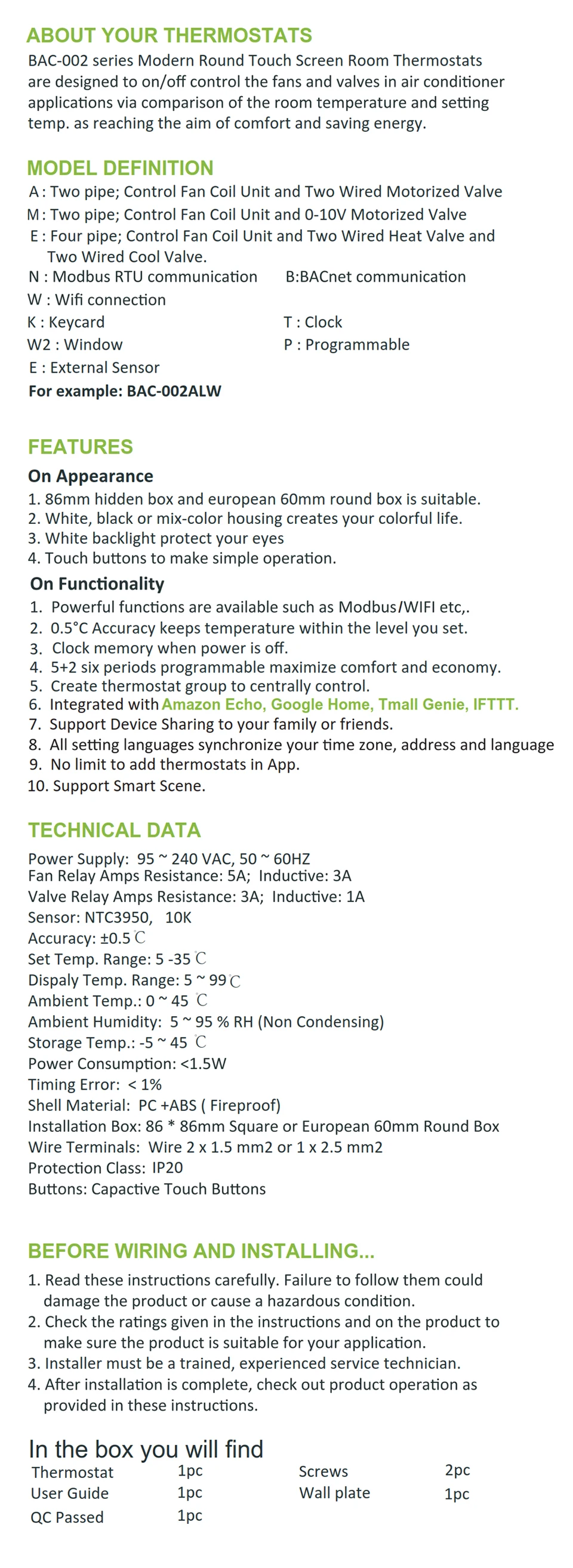 Термостат для кондиционера, 2 вентилятора, Wi-Fi, для Amazon, Alexa...