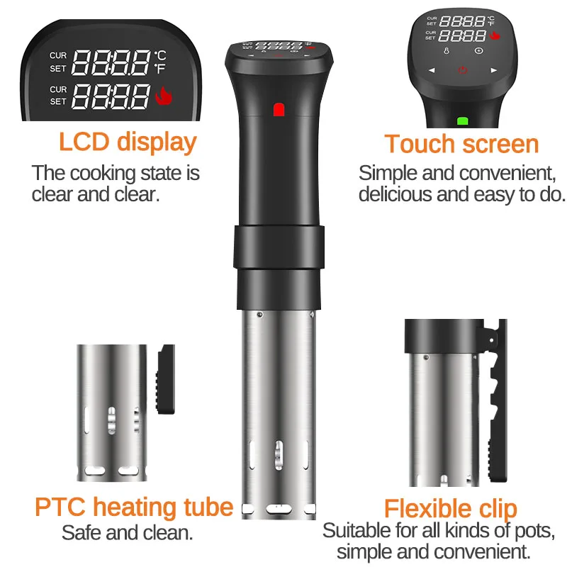 Простота в использовании-Просто прикрепите плиту Sous Vide к кастрюле любого размера с помощью регулируемого зажима, а затем установите время и температуру, нажмите на значок на сенсорном экране, чтобы включить/выключить и подтвердить настройки. Простота в эксплуатации и в течение нескольких секунд.