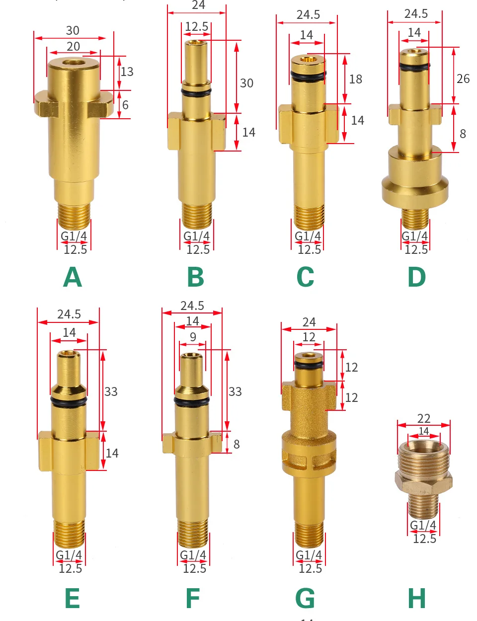 2. Так как существует два типа адаптера для этой марки мойки высокого давления. Пожалуйста, проверьте размер адаптера и убедитесь, что он подходит для вашей машины. Мы не несем никакой ответственности за несовместимость адаптера. Если вы не уверены, пожалуйста, пришлите нам фото вашего пистолета и копья, мы поможем выбрать подходящий адаптер.