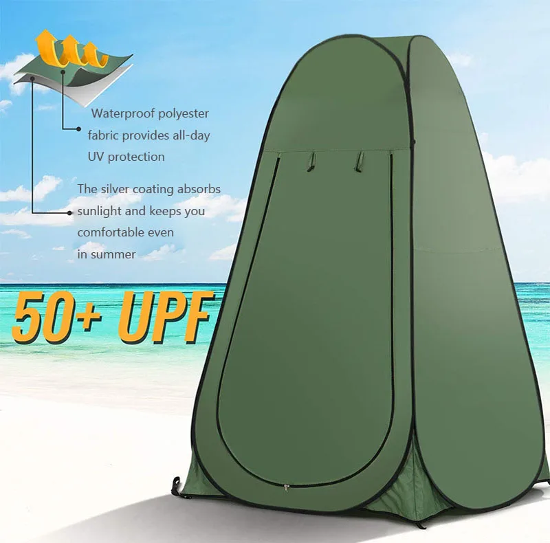 Защита от ультрафиолета и водоотталкивающая: водонепроницаемая полиэфирная ткань черного цвета с серебряным покрытием сохраняет внутреннее укрытие сухим и защищает вас от 98% вредных ультрафиолетовых лучей солнца. Легкий, компактный Пляжный Тент обеспечивает защиту от солнца, дождя и ветра для всех видов активного отдыха. И это дает вам частный приют, чтобы изменить одежду, принять душ, использовать туалет, и многое другое на пляже или в лагере.