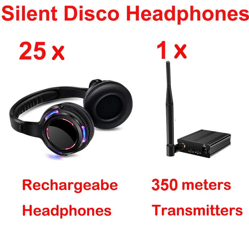 Профессиональные бесшумные диско-наушники с 25 светодиосветодиодный, дальность 500 м, с 1 передатчиком, радиочастотная беспроводная, для диджея, клуба вечерние, встречи, трансляции