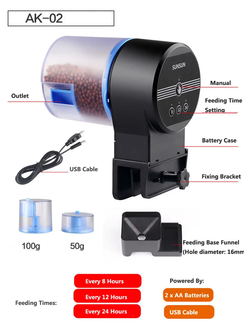Питание от двух аккумуляторов AA(Не входит в комплект)Или adatper 5V 1A Делает овладение рыбой более легкой задачей. Не беспокоясь, чтоВаша рыба можетГолодать, когда вы на призвание. Простота в использовании, простота в эксплуатации и установке, ручная и автоматическая. Влагостойкий Хоппер сохраняет еду свежей и вмещает большинство видов пищи, включая хлопья, гранулы или крошки. Вы можете установить время подачи или сразу начать подачу нажатием кнопки «8/12/24». Слот для корма прозрачный, поэтому вы знаете, сколько еды осталось внутри.Регулируемое время подачиВы можете питаться от 1 до 3 раз в день (на Кормушке), максимум 10 раз в зависимости от выбранного вами варианта.