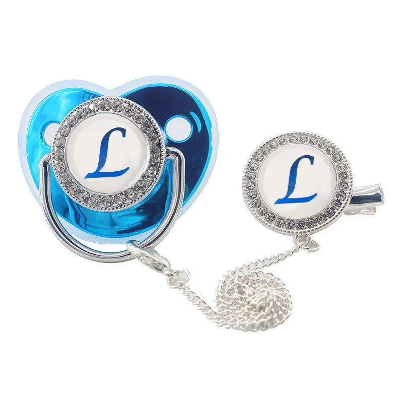 Соска-пустышка силиконовая голубая с буквами и зажимами
