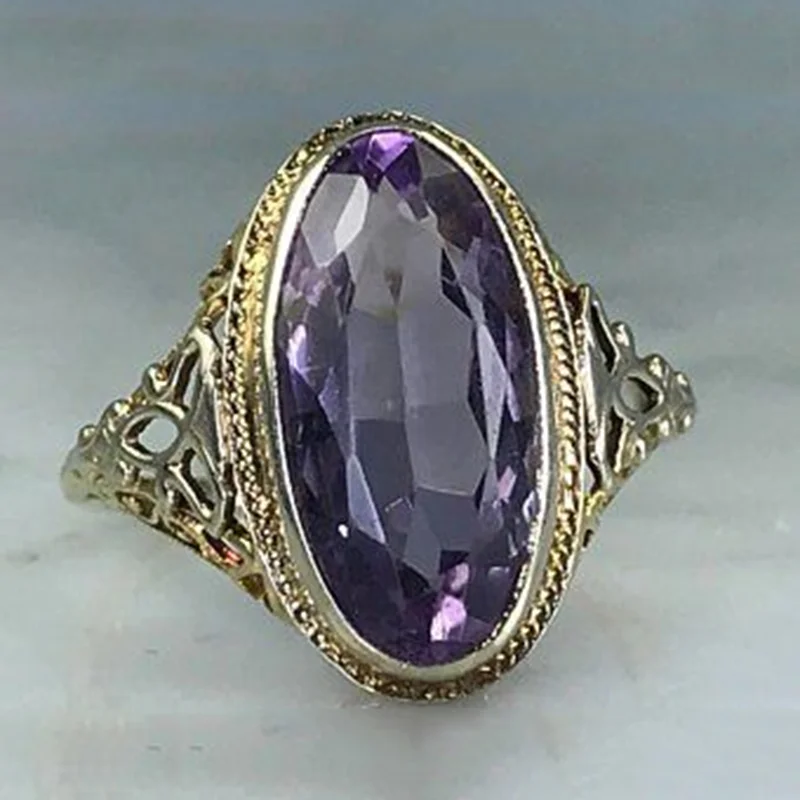 Женское кольцо с крупным фиолетовым овальным кристаллом, Винтажное кольцо золотого цвета в дворцовом стиле, вечерние ное и праздничное Ювелирное Украшение для повседневной жизни