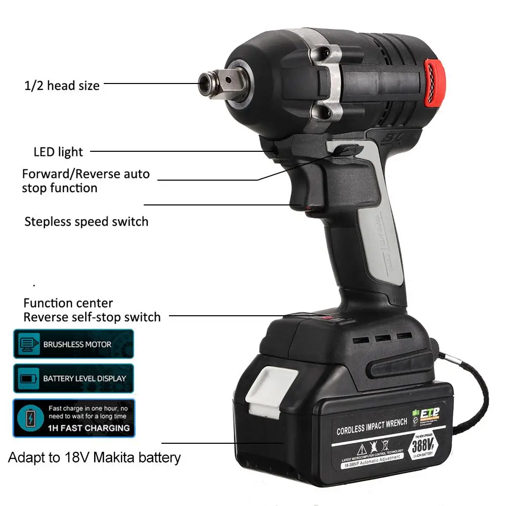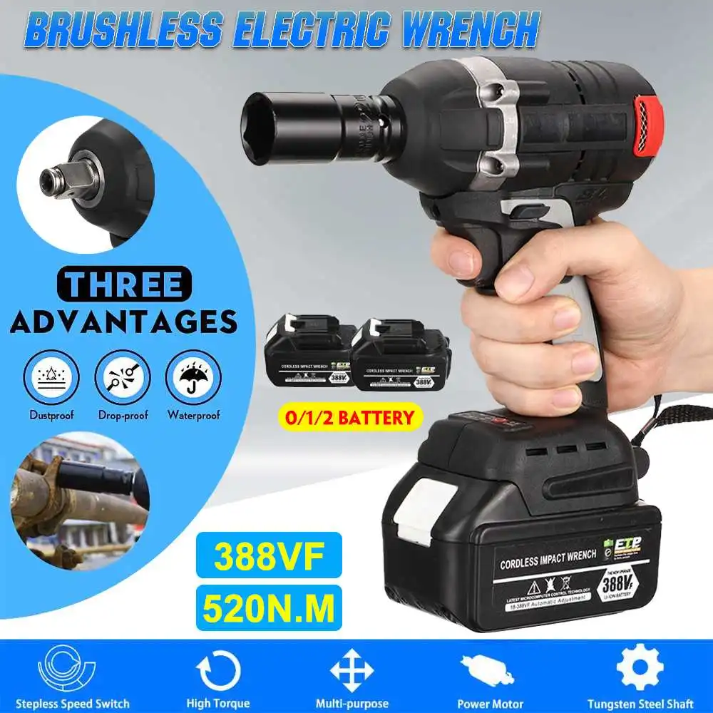 Бесщеточный Электрический ударный гайковерт 388VF 520N.m, перезаряжаемая электрическая отвертка, аккумуляторная Светодиодная дрель для пистолета Makita, батарея 18 в