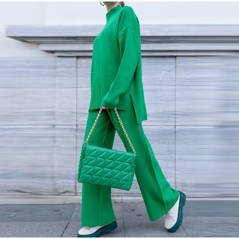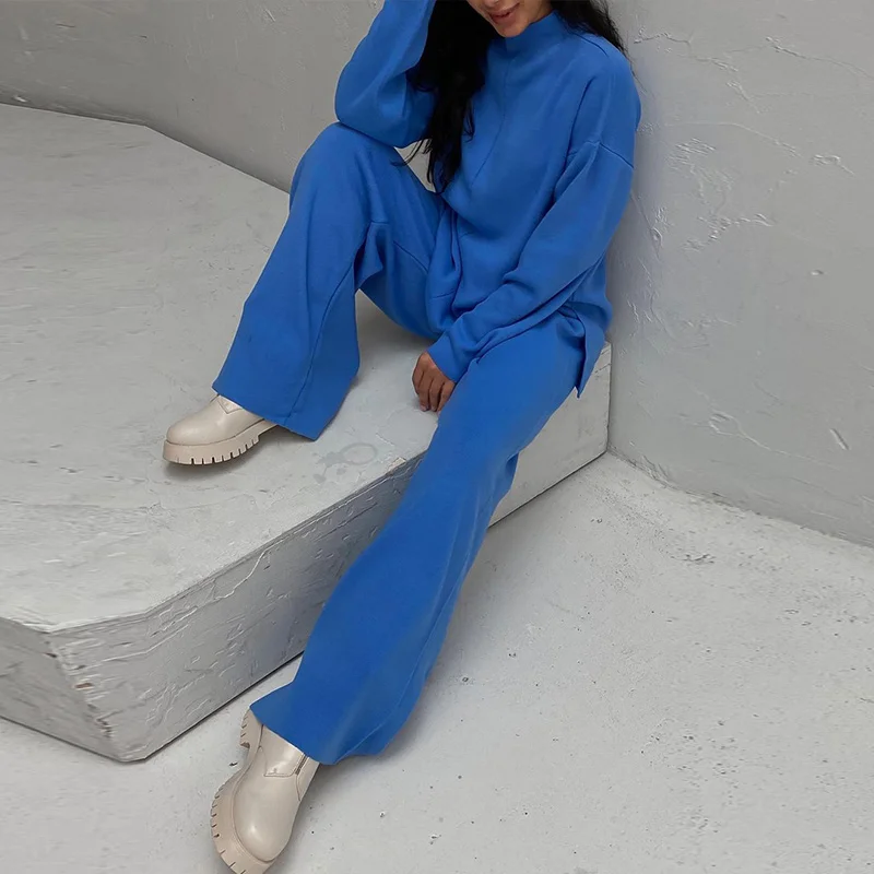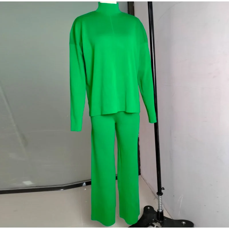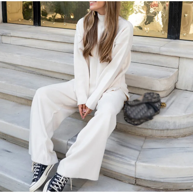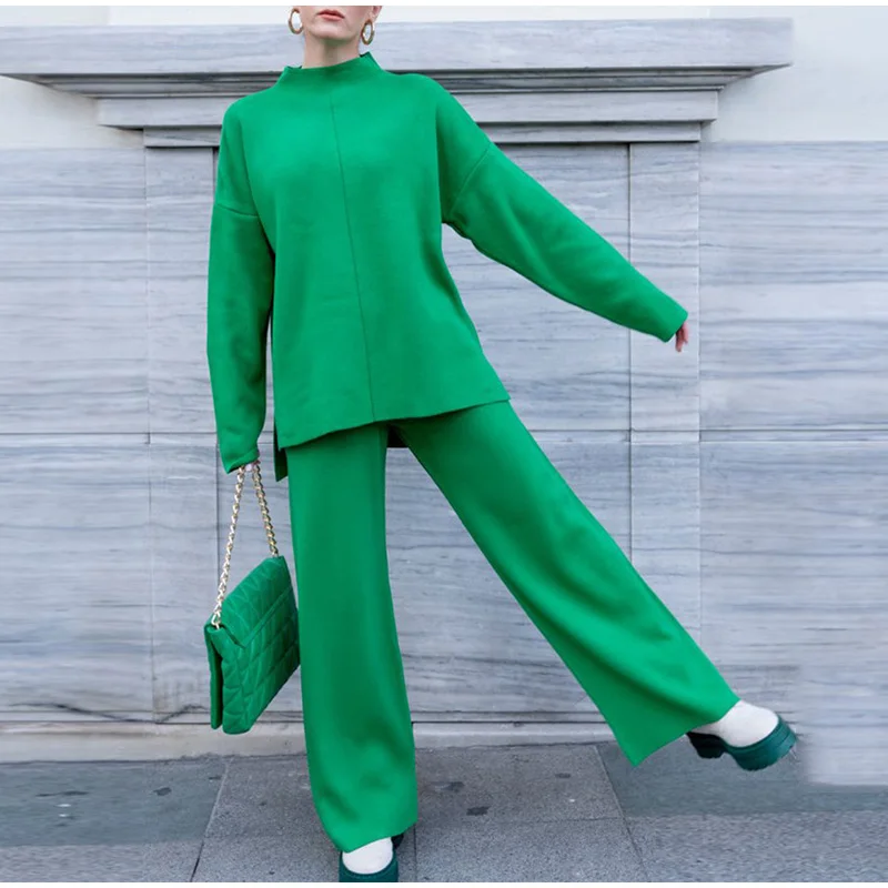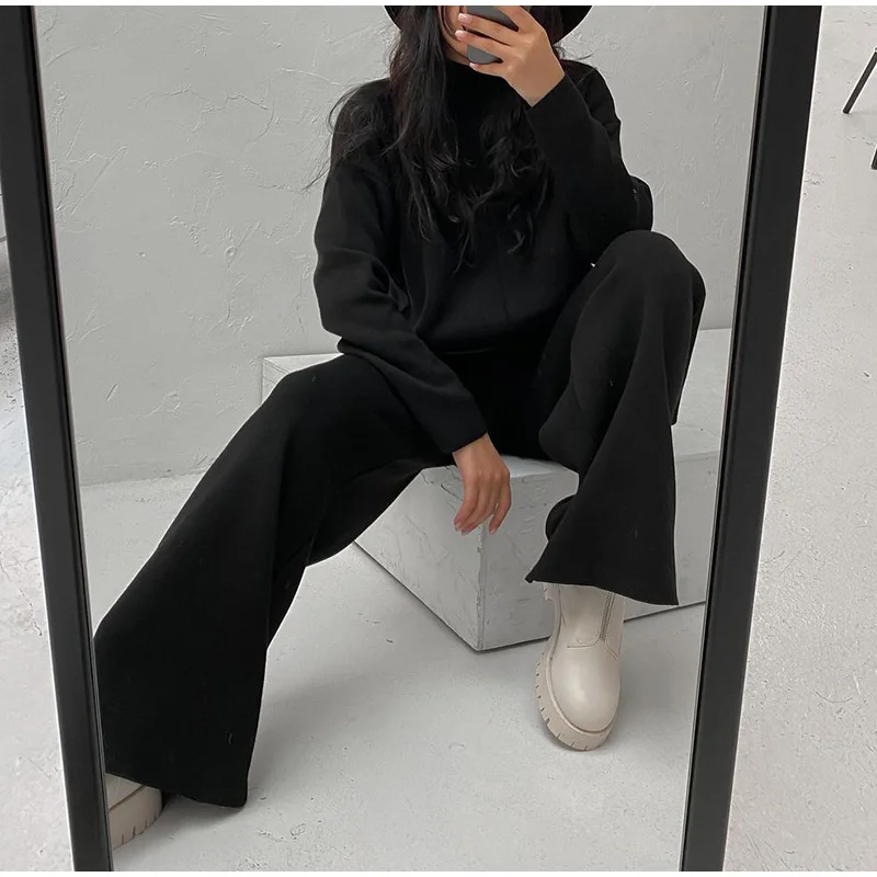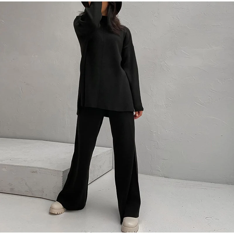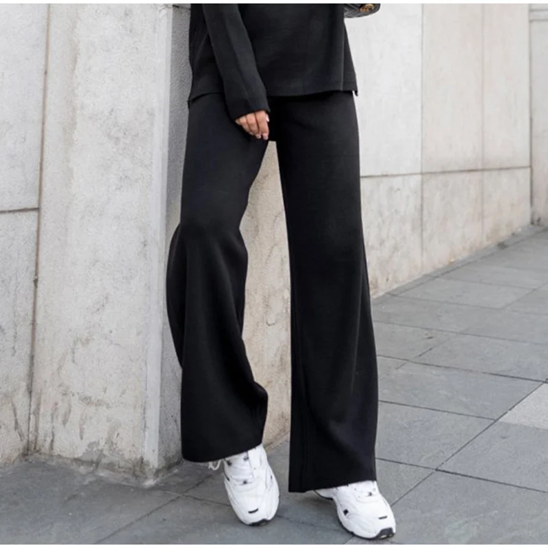 Женский трикотажный брючный костюм, повседневный однотонный комплект из двух предметов, Топ с длинным рукавом и брюки с широкими штанинами, Осень-зима 2021