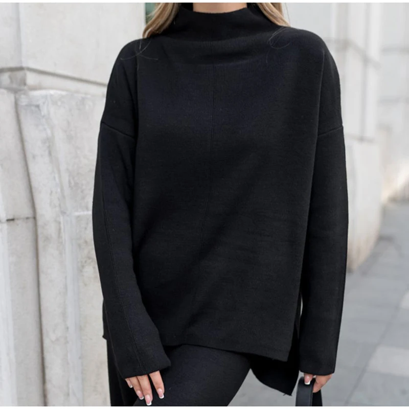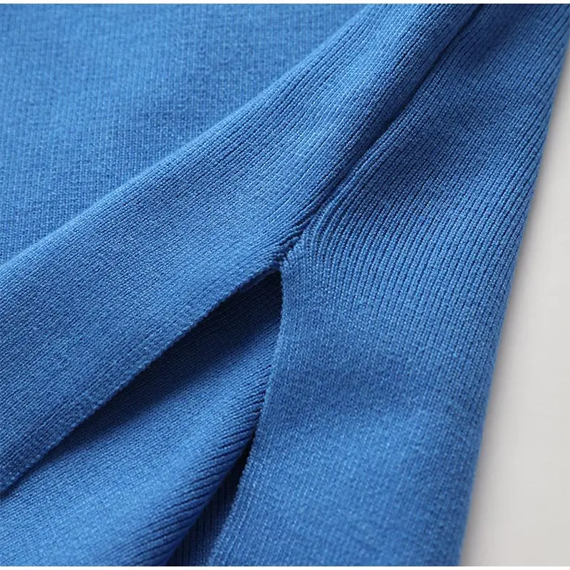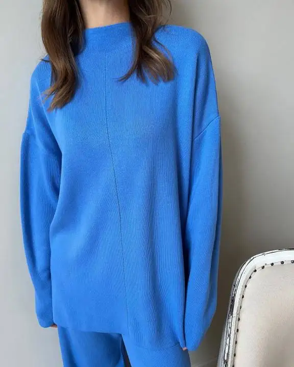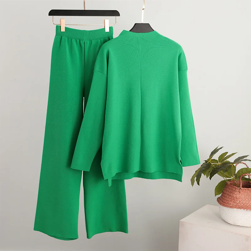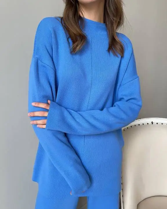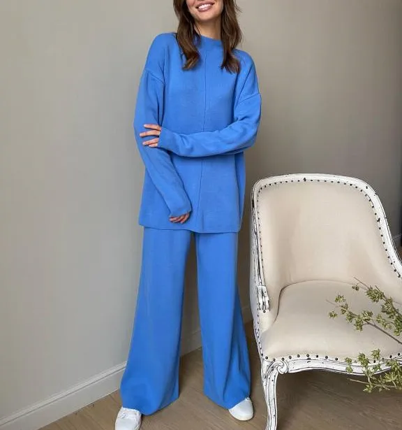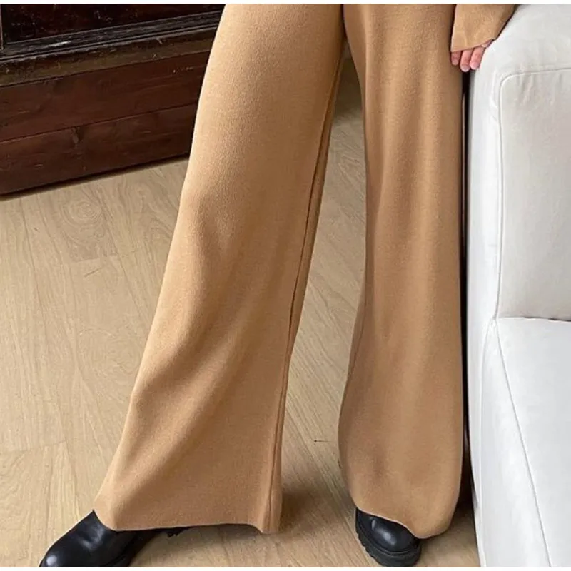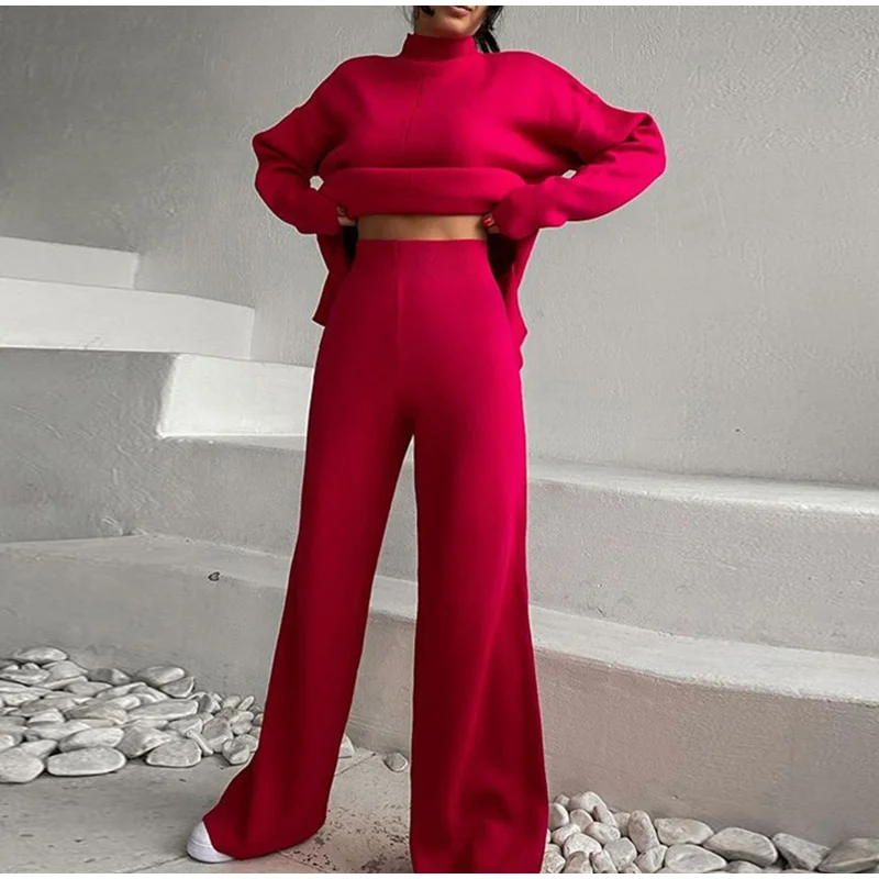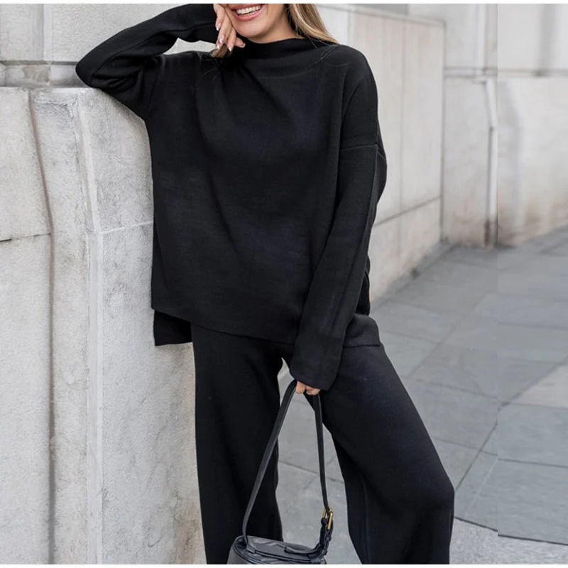 Женский трикотажный брючный костюм, повседневный однотонный комплект из двух предметов, Топ с длинным рукавом и брюки с широкими штанинами, Осень-зима 2021