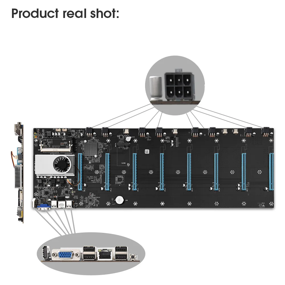 Описание:8 слотов для видеокарт xPCIE 16X, расстояние 575 мм.Высокая производительность вычислений, на 10% выше, чем Материнские платы того же уровня.Стабилизирующий конденсатор напряжения может обеспечить стабильное напряжение для вашего оборудования электропитания.Он может обеспечить тихую производительность, низкое энергопотребление, меньшее количество тепла, энергосбережение и безопасное использование.Оснащен слотом памяти sodimm DDR3, питание 8x6PIN PCIE X16, разъем питания, значительно повышает производительность материнской платы.
