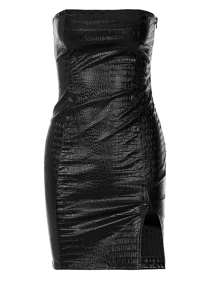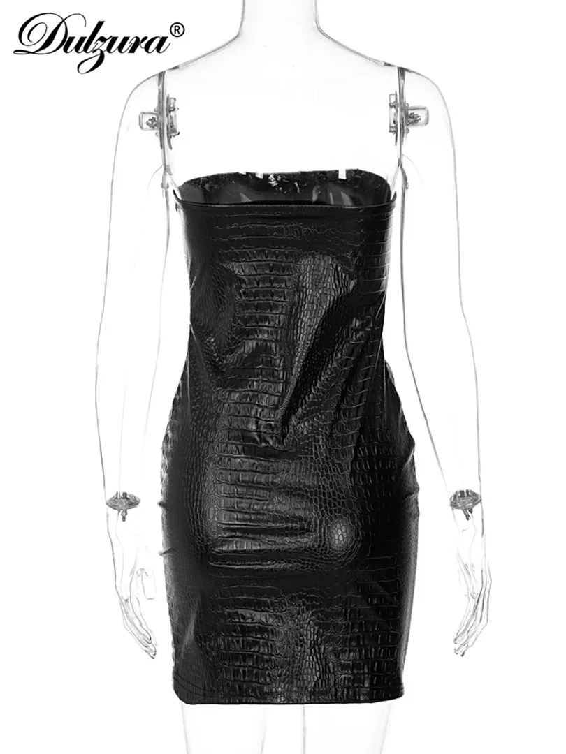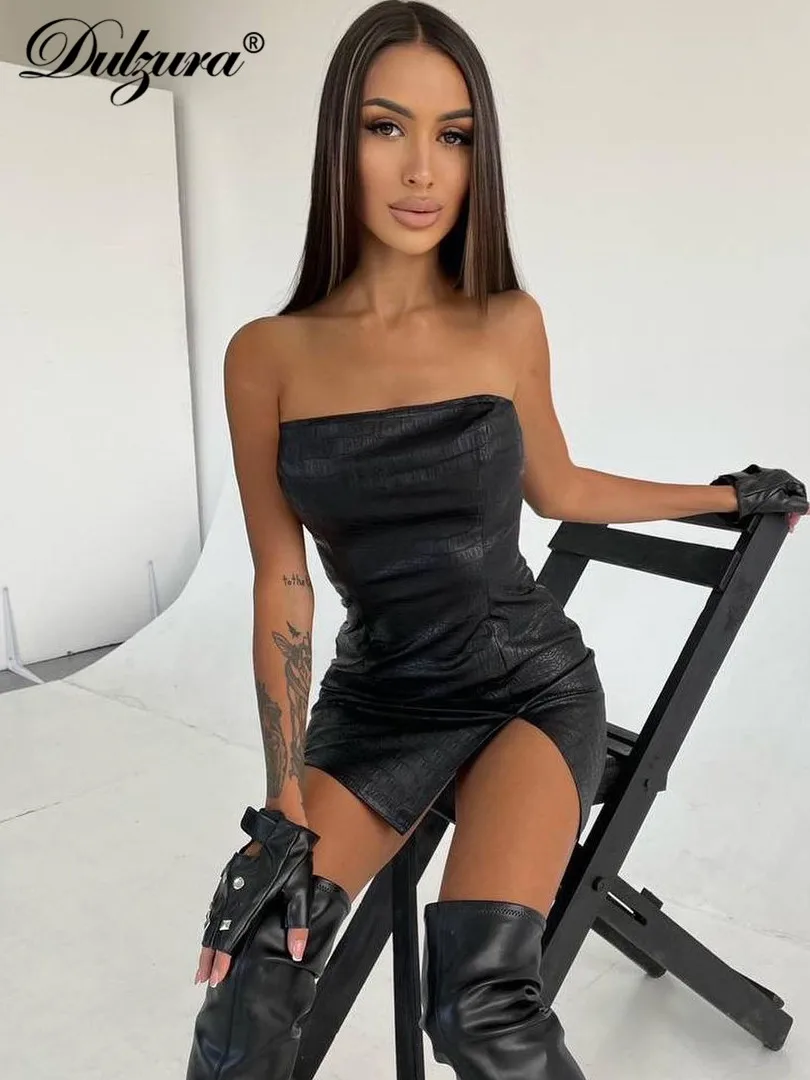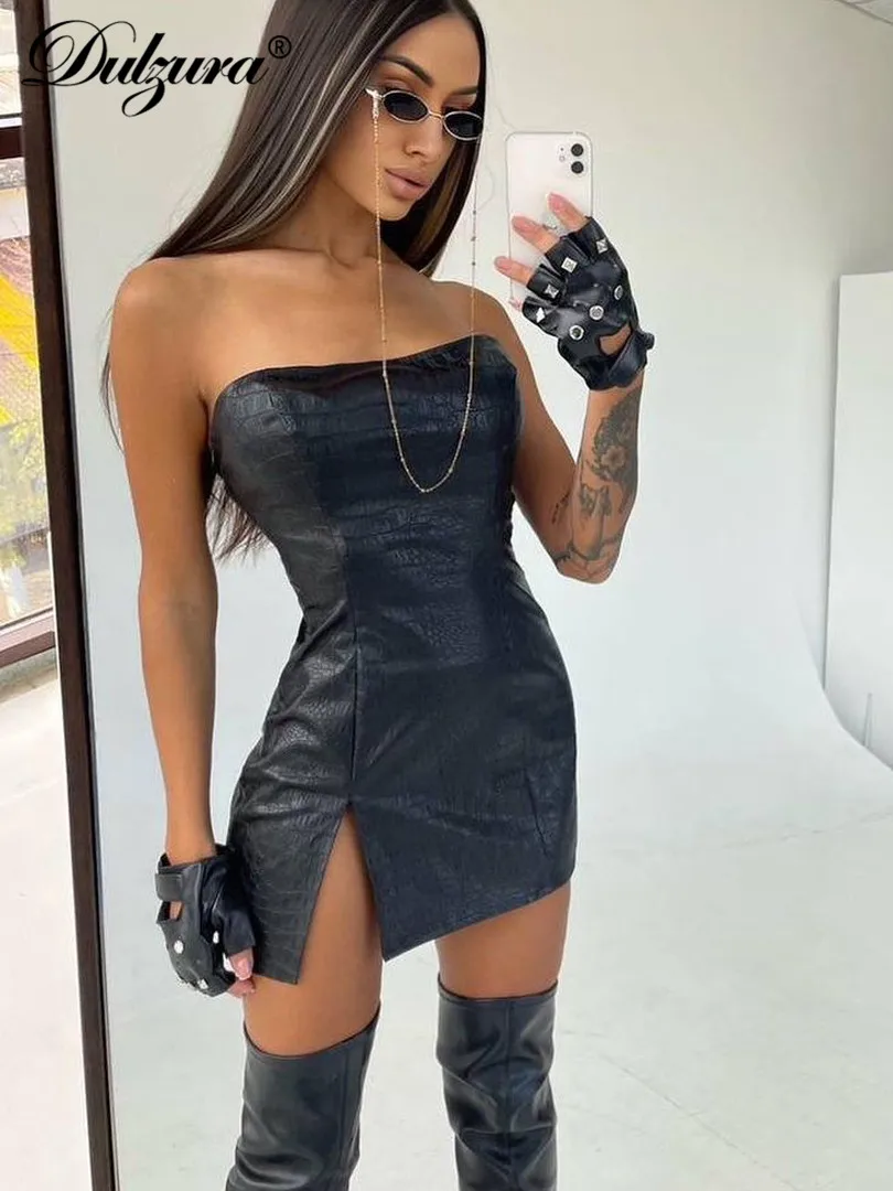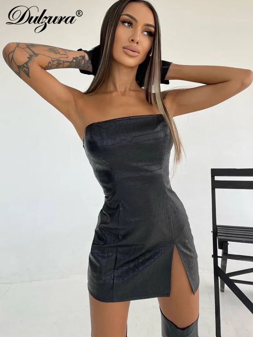 Dulzura Pu искусственная кожа женские мини-платье с разрезом и открытыми плечами облегающее сексуальное уличная вечерние ночного клуба фестиваль 2021 осенне-зимняя одежда для мальчиков