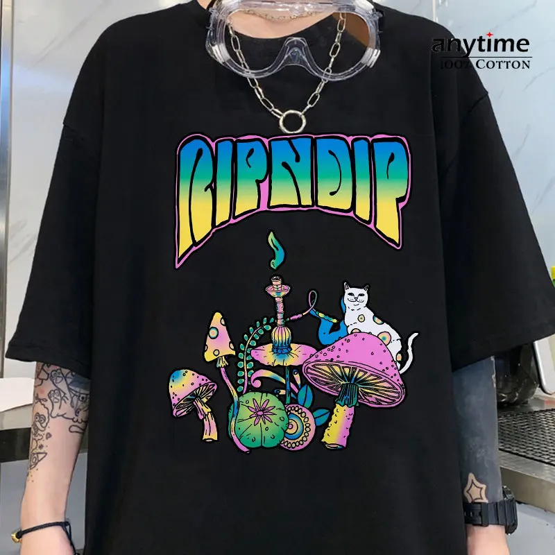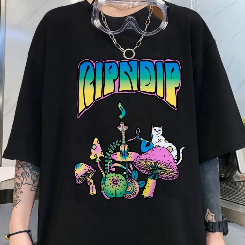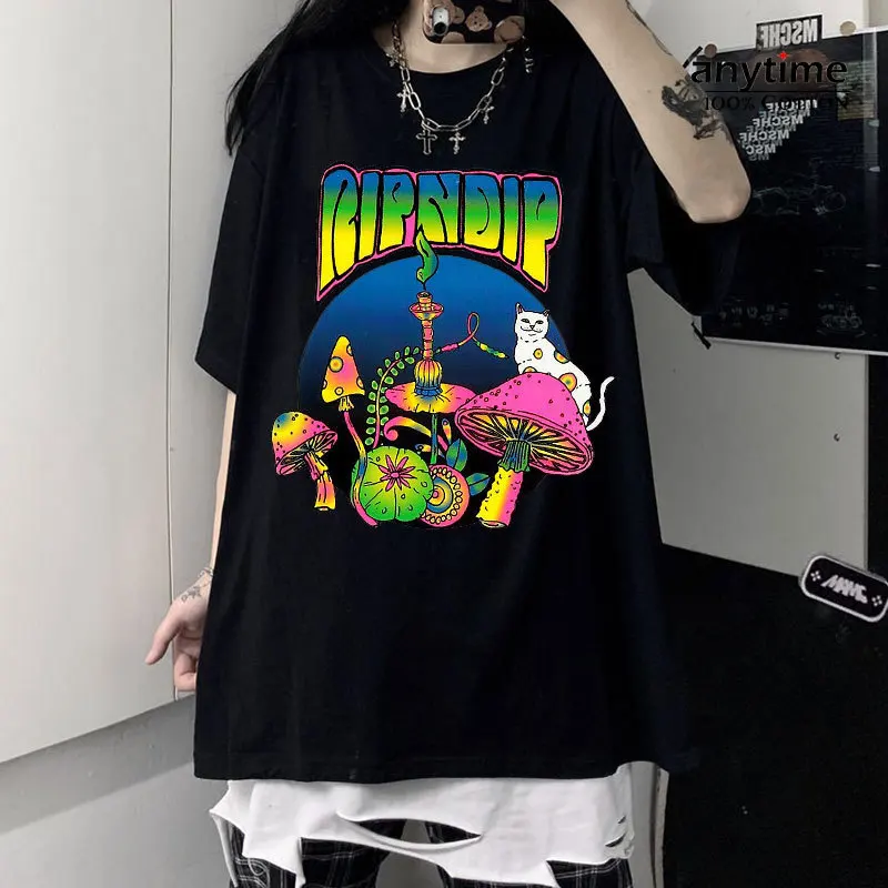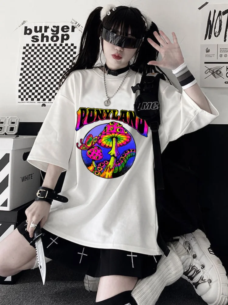 Футболка Harajuku с разноцветным рисунком грибов и котят, Повседнев...