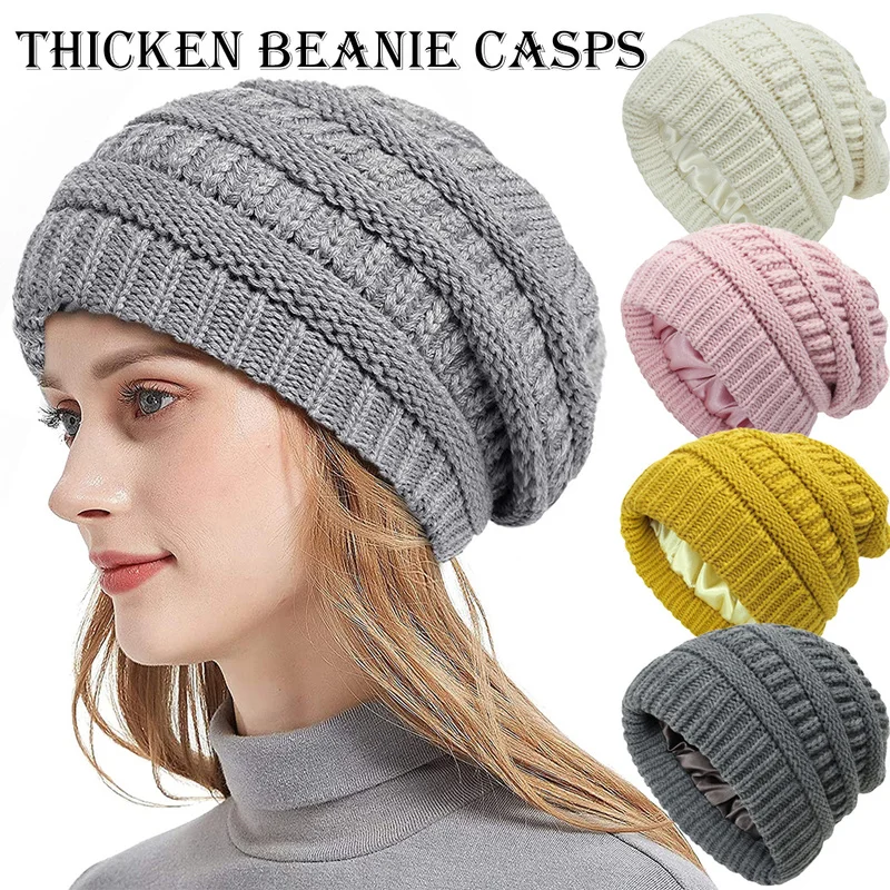 Женская вязаная мешковатая шапка, зимняя теплая шелковая атласная подкладка, крупные женские шапочки, шерстяные облегающие шапки, шапки для лыжного спорта и велоспорта