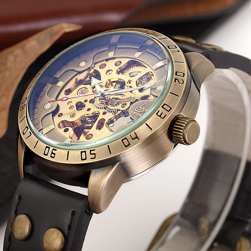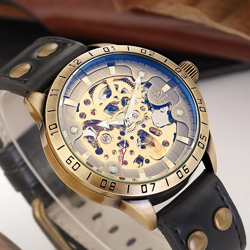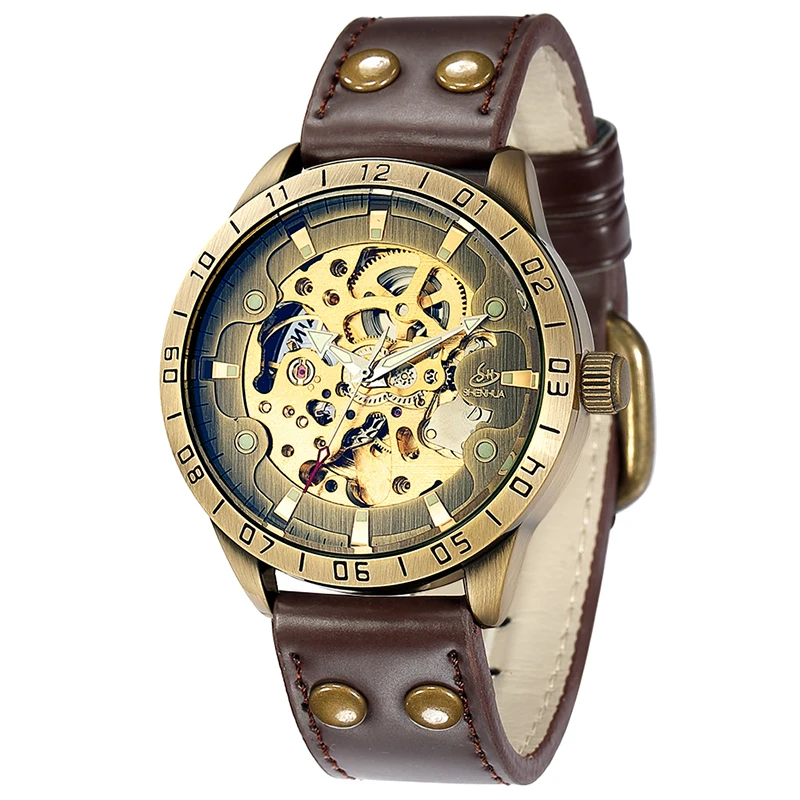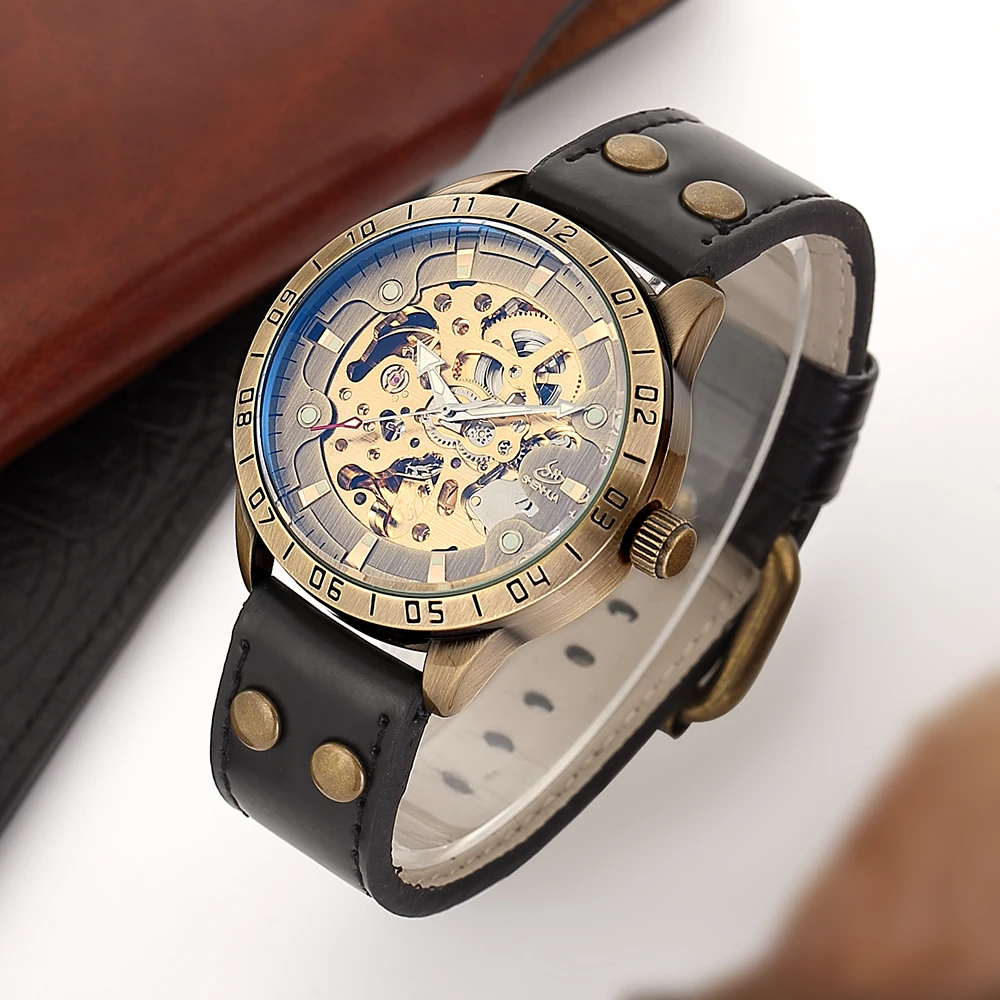 Часы мужские механические с автоподзаводом, винтажные коричневые скелетоны в стиле стимпанк, с кожаным ремешком, с бронзовым ремешком, с автоподзаводом