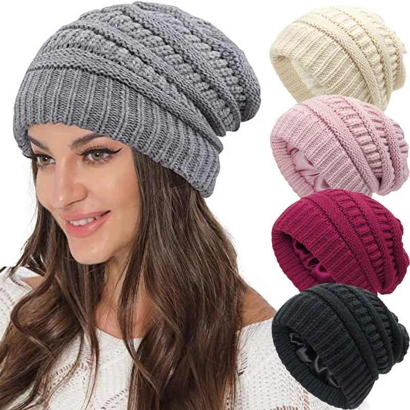 Женская вязаная мешковатая шапка, зимняя теплая шелковая атласная подкладка, крупные женские шапочки, шерстяные облегающие шапки, шапки для лыжного спорта и велоспорта