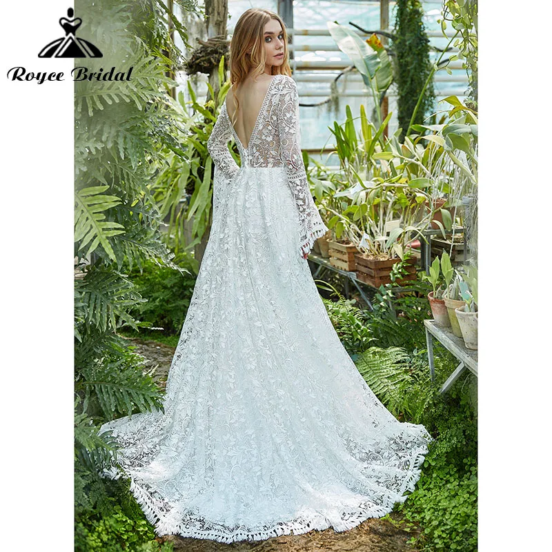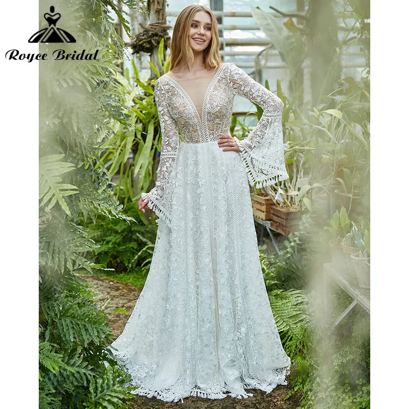 Свадебное платье А-силуэта в стиле бохо, Пляжное богемное платье с длинными расклешенными рукавами, глубоким V-образным вырезом и открытой спиной, кружевные иллюзионные Свадебные платья на заказ, 2022