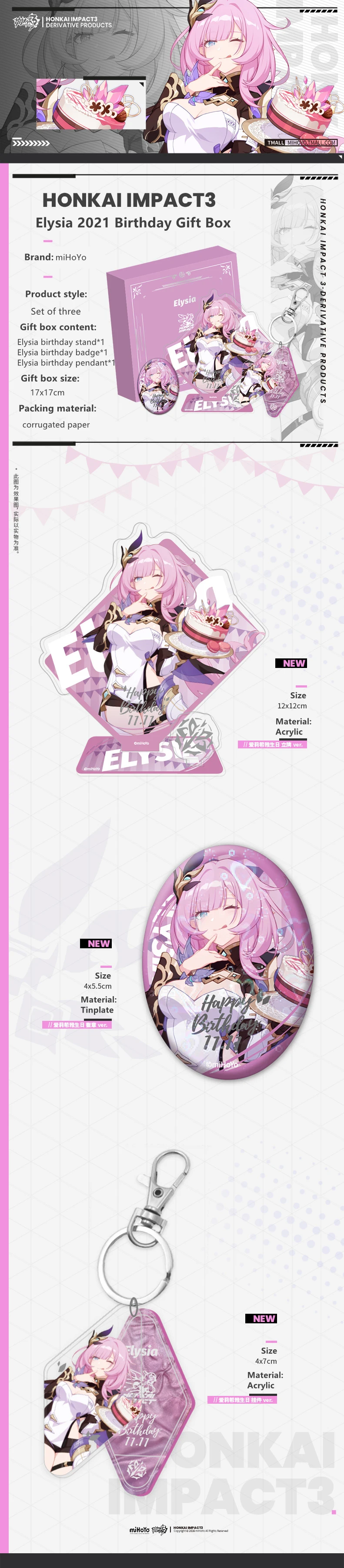 Аниме игра Honkai Impact 3 Косплей Elysia 2021 подарок на день рождения Рождественский подарок значок подвеска персонаж Стенд набор из трех частей