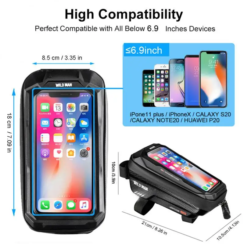 Сумка для горного велосипеда WILD MAN, передняя велосипедная сумка, водонепроницаемая сумка для телефона с сенсорным экраном 6,5 дюйма, мобильный телефон чехол из ЭВА, Жесткий Чехол, сумки