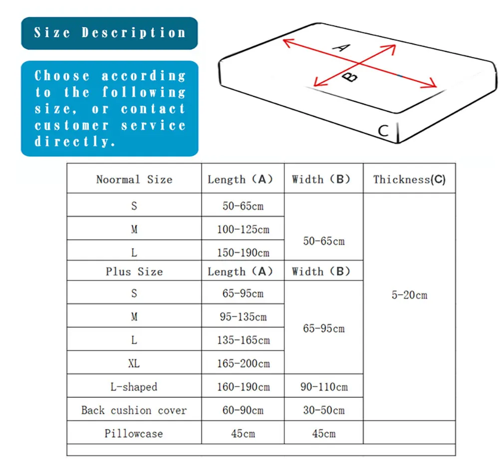Подходящий размерный ряд:Нормальный Размер 1(S): Длина 50-65 см ширина 50-65 см толщина 5-20 смНормальный размер 2 (м): Длина 100-125 см ширина 50-65 см толщина 5-20 смНормальный Размер 3(L): Длина 150-190 см ширина 50-65 см толщина 5-20 смПлюс Размер 1(S): Длина 65-95 см ширина 65-95 см толщина 5-20 смПлюс Размер 2 (м): Длина 95-135 см ширина 65-95 см толщина 5-20 смПлюс Размер 3(L): Длина 135-165 см ширина 65-95 см толщина 5-20 смПлюс Размер 4(XL): Длина 165-200 см ширина 65-95 см толщина 5-20 смL-образной формы: Длина 160-190 см ширина 90-110 см толщина 5-20 смЧехол для задней подушки: Длина 60-90 см ширина 30-50 см толщина 5-20 смНаволочка: 45*45 см