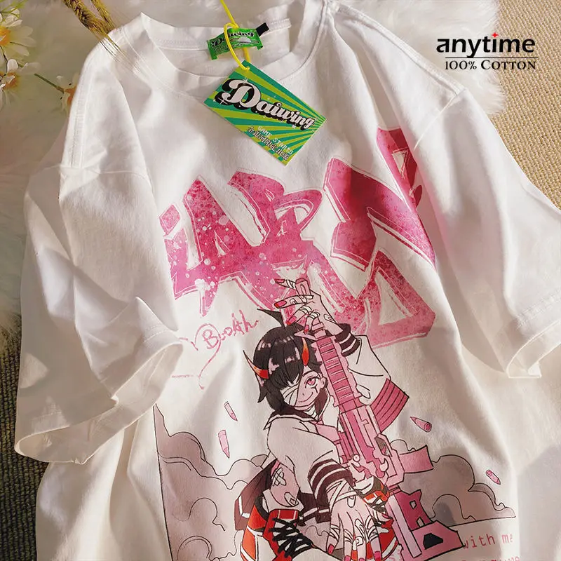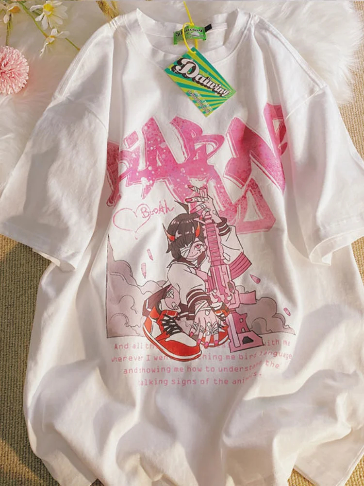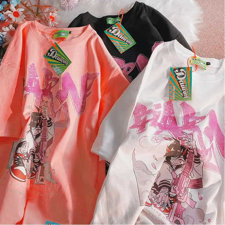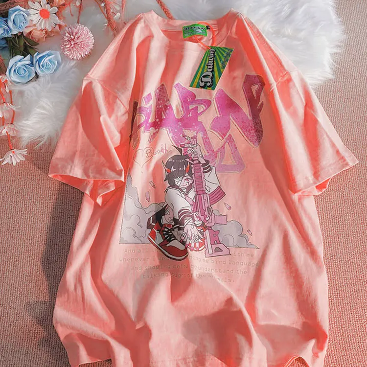 Футболка женская хлопковая в японском стиле, милая Повседневная Свободная рубашка в стиле Харадзюку, с мультяшным принтом, розовая уличная одежда, лето