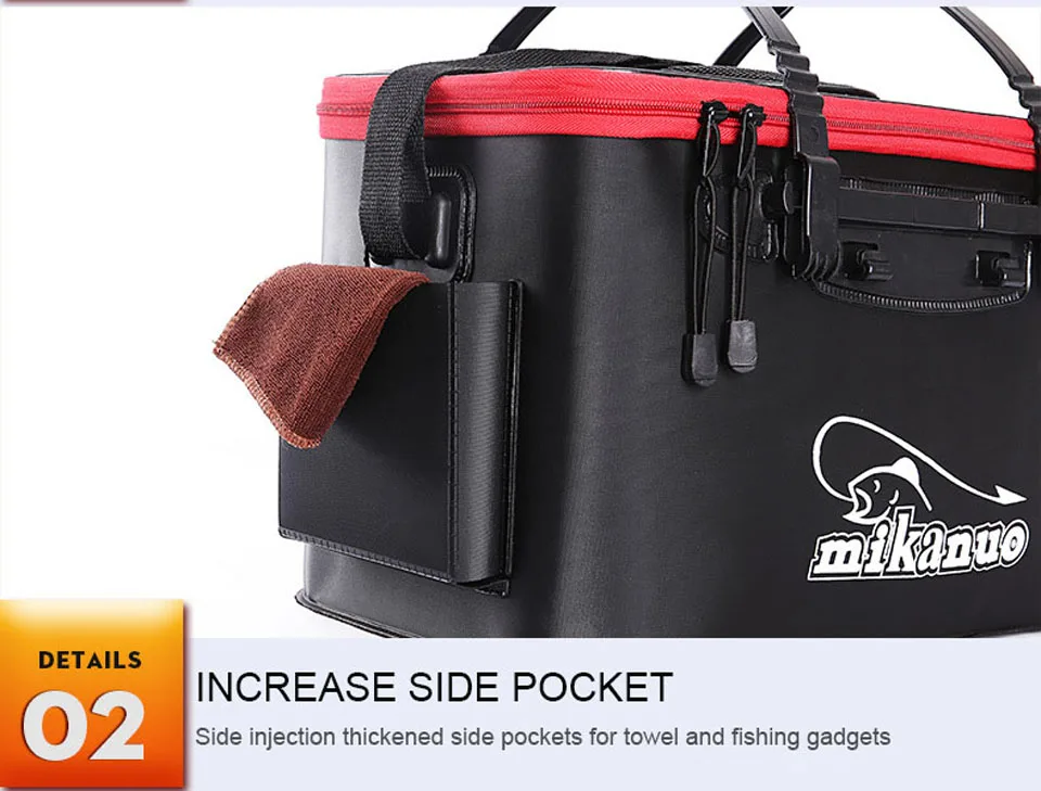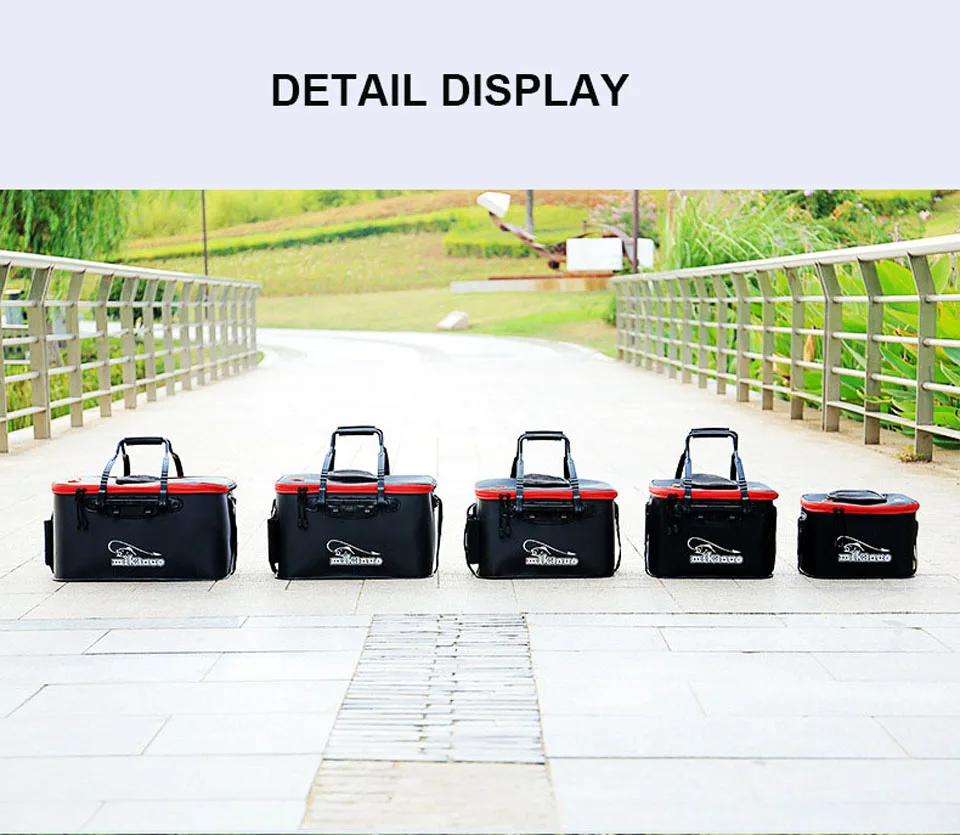 Хранение воды для кемпинга, пеших прогулок, а также для живой приманки, многофункциональные инструменты. Боковой карман для кислородного насоса, который сделает ваши рыбки дышащими, а сетчатая крышка делает более удобными, когда вы вставляете рыбы внутрь и наружу.