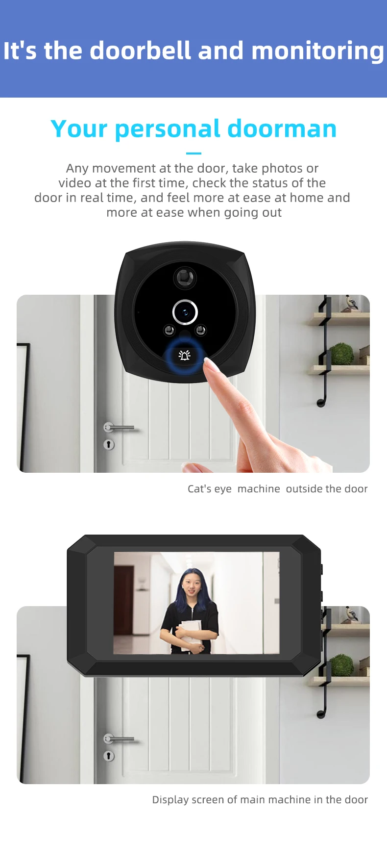Ваш личный дверной ЗвонокЛюбое движение за дверью, снимайте телефоны или видео в первый раз, проверяйте состояние двери в режиме реального времени и чувствуйте себя более комфортно дома и более легко при выходе из дома