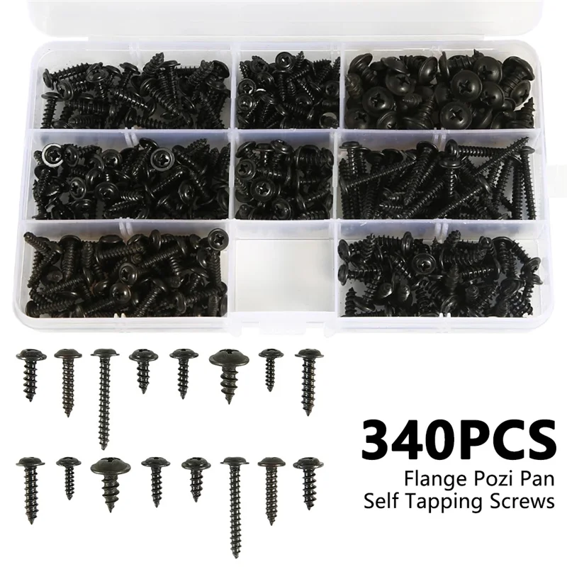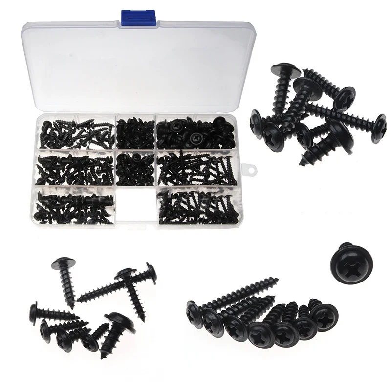340 шт. PWA крест Самонарезающий черный винт M3 M3.5 M4 M4.8 углеродистая сталь круглый болт с головкой комплект шайб в ассортименте