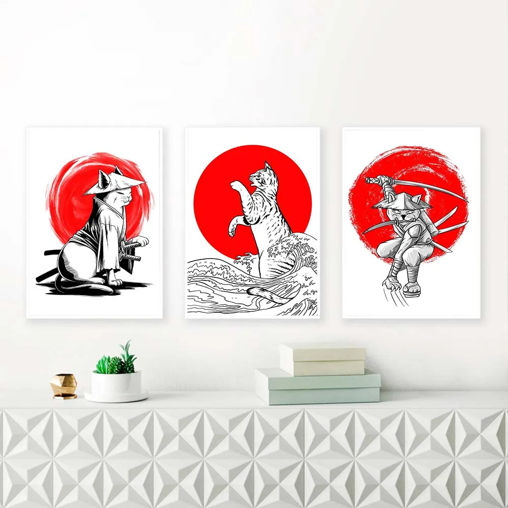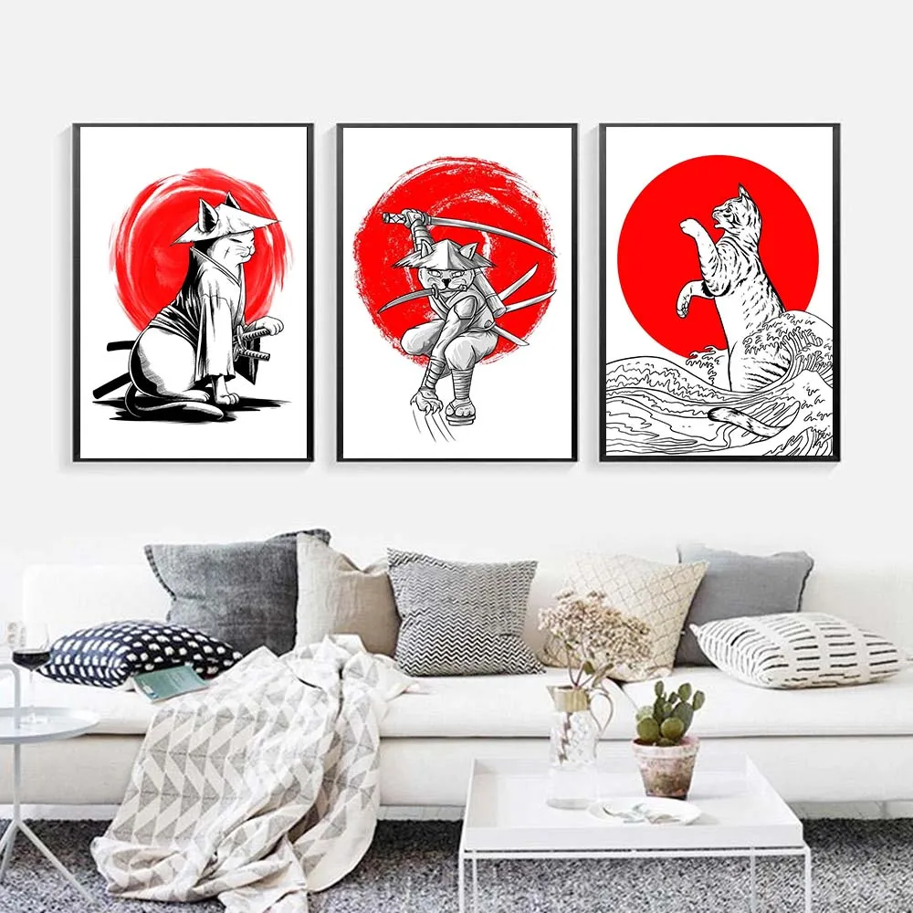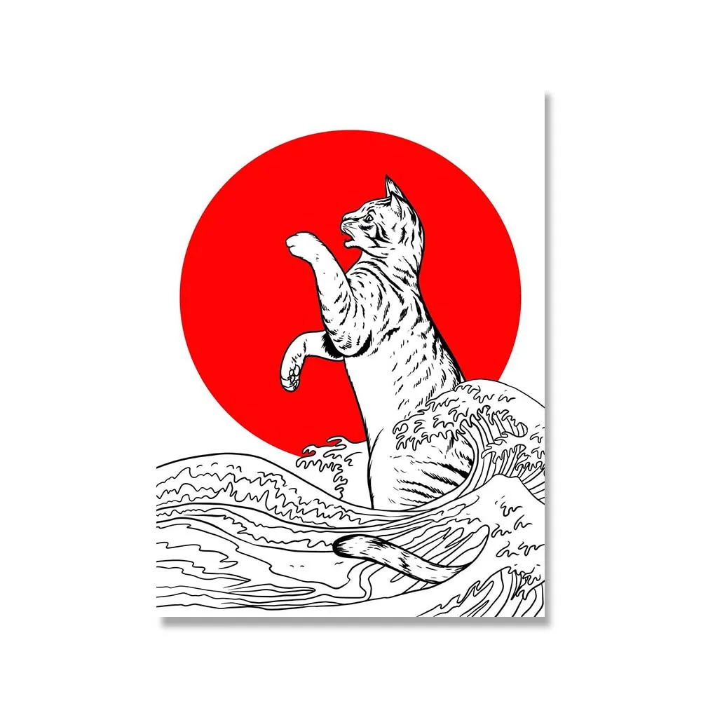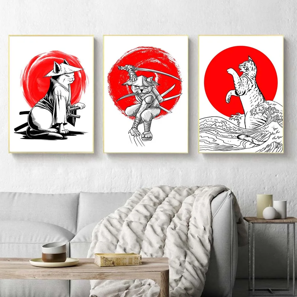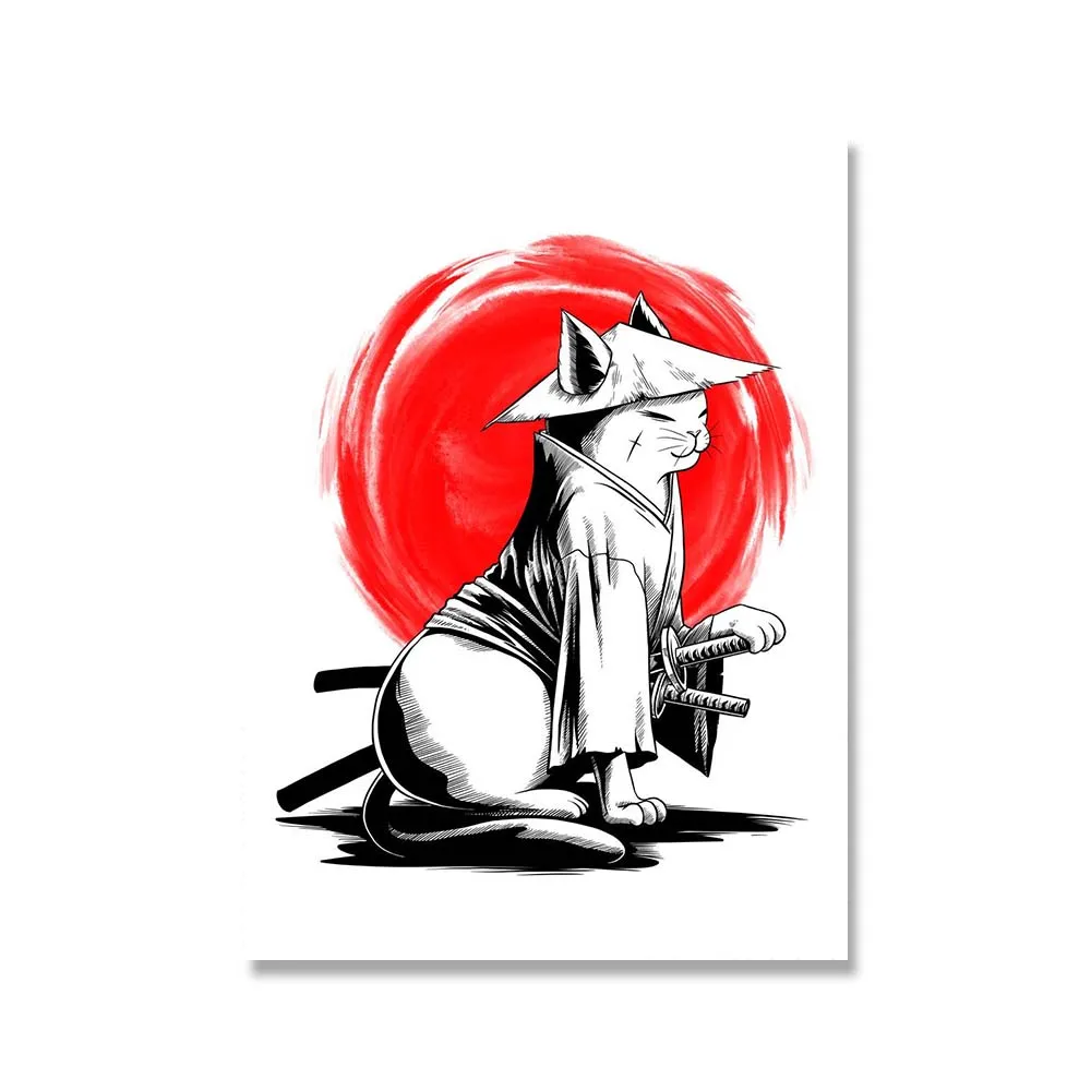 Животные самурайский Кот Красный солнце японское искусство на холсте постеры и принты на стену в скандинавском стиле декор для гостиной спальни