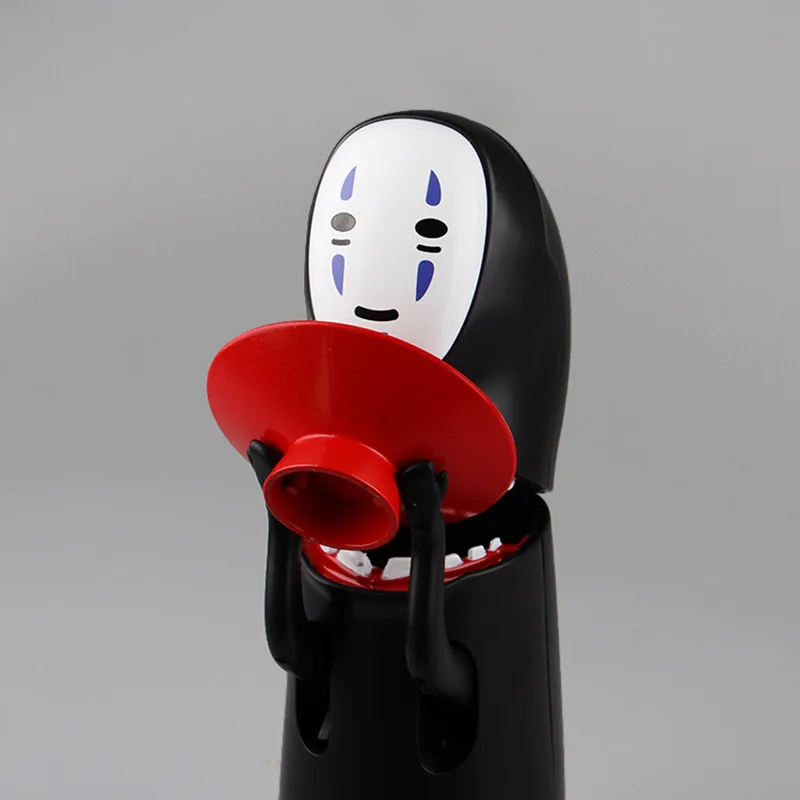 Узоры на лицевой стороне человека трехмерны и ясны. Вес приводаМашина может датчик веса и сделать следующий глотание двигаться автоматически. Активная музыкаМузыка начнется, когда вы положите монету на тарелку. И после того, как человек без лица проглотит монеты, машина издаст храп. Гибкий зубЗуб на безлицевой полости человека является гибким, чтобы показать яркое представление о жевании монет. Активное соединениеАктивное соединение руки без лица-это преимущество для точного ввода монет в рот.