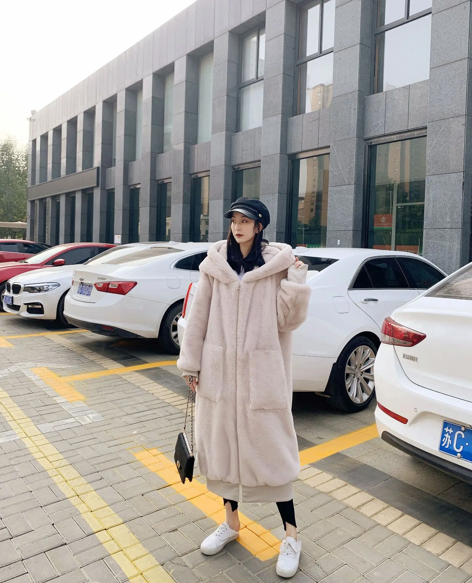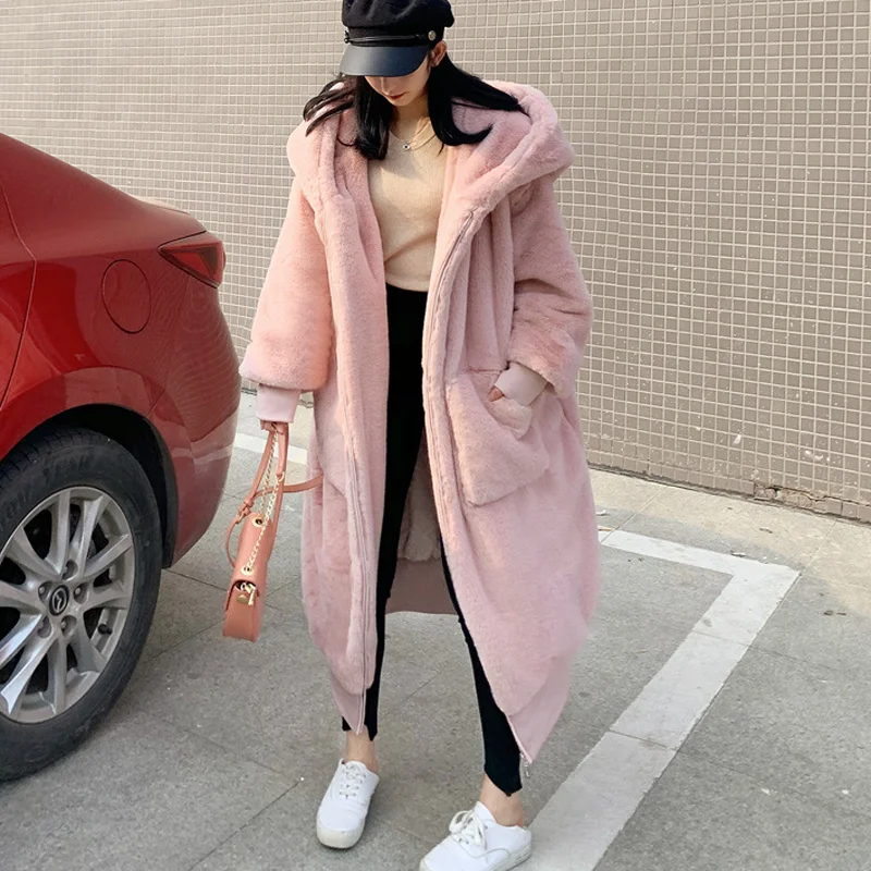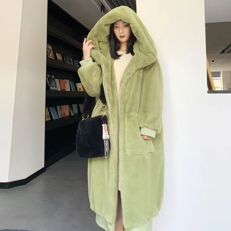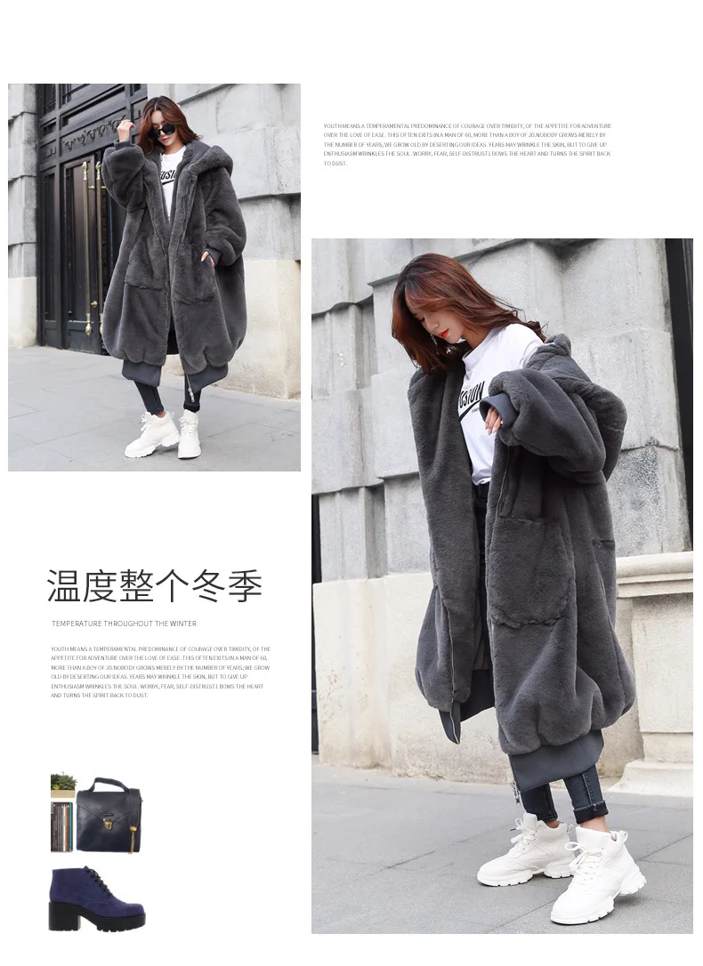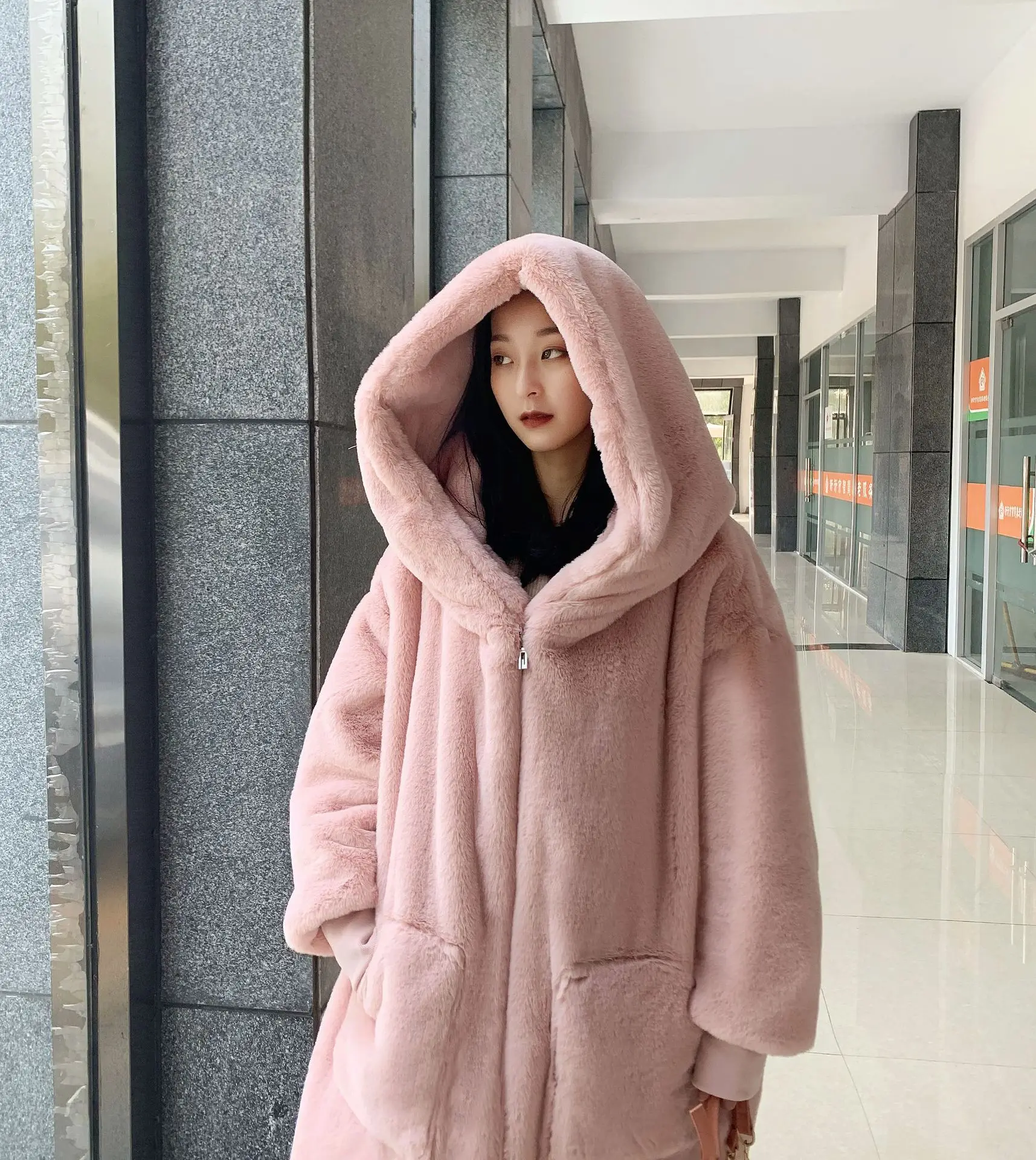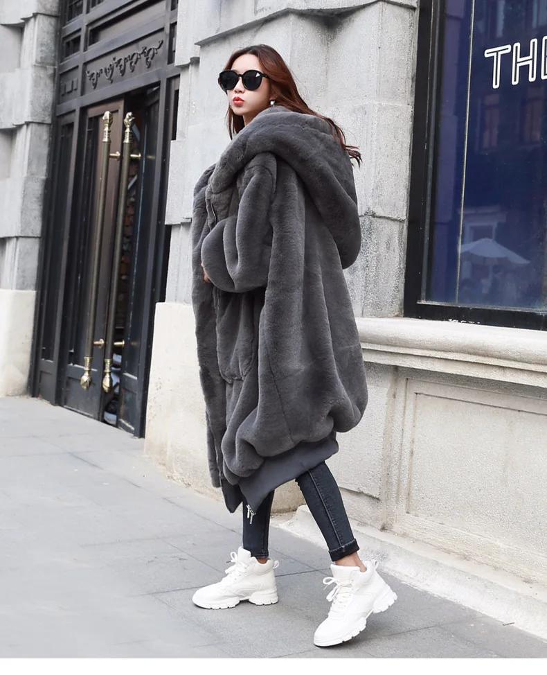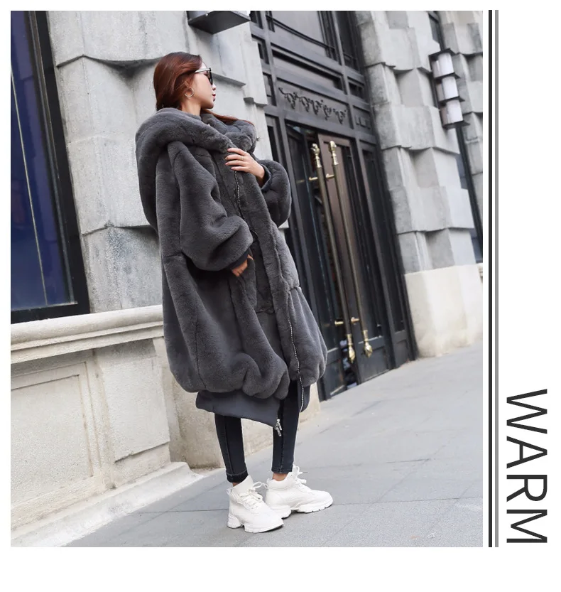 2021 осенне-зимнее модное пальто для женщин, новое пальто из искусственного меха кролика Рекс, утолщенное длинное пальто с капюшоном, меховое пальто для женщин