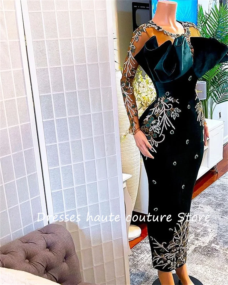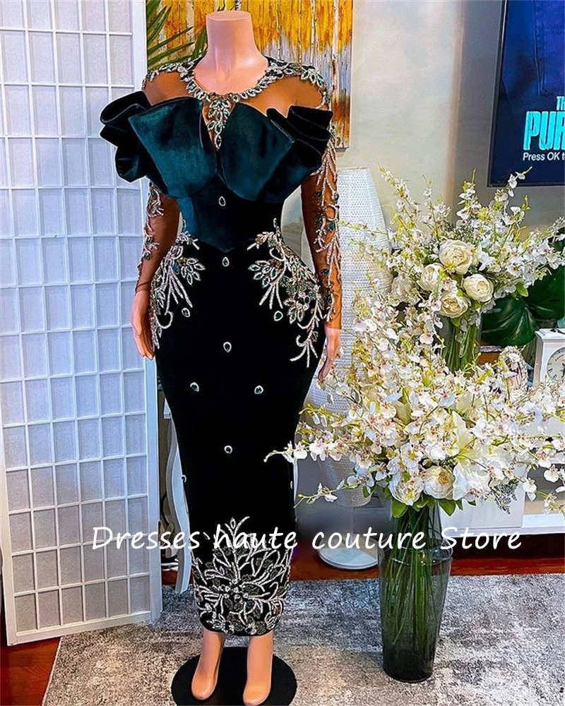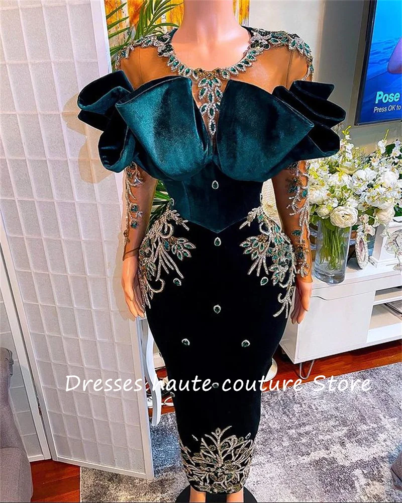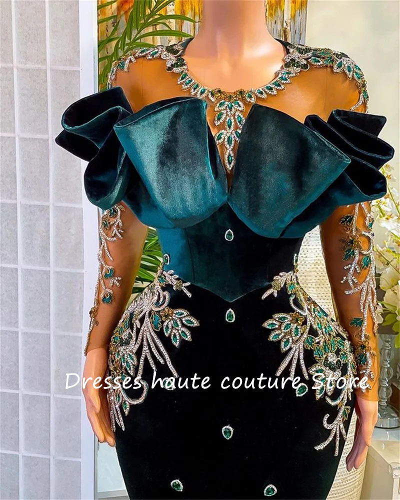 Роскошное зеленое вечернее платье Aso Ebi в африканском стиле с кристаллами и бусинами, 2021, вечернее бархатное платье с глубоким круглым вырезом и длинным рукавом, бальные платья для выпускного вечера