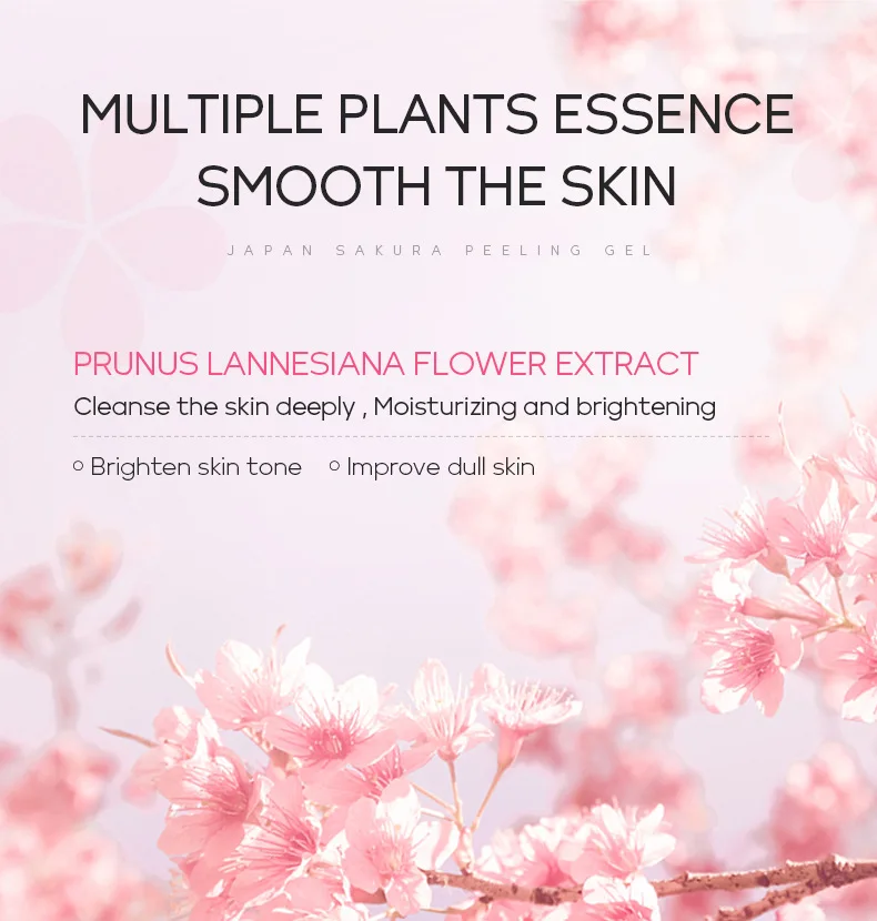 Содержит экстракт листьев камелии Синенсис и глицей, пилинг Сакура гель может мягко удалить мертвую кожу и яркий тон кожи. Благодаря функциям расслабления кожи, устранения грязи, которая вызывает акне и угри, а также уменьшения акне, ваша кожа гладкая и нежная, и дайте ей снова дышать.