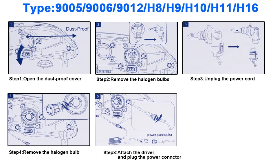 H7, H8/H9/H11/H16JP, 9005/HB3,9006/HB4, 9012/Hir2