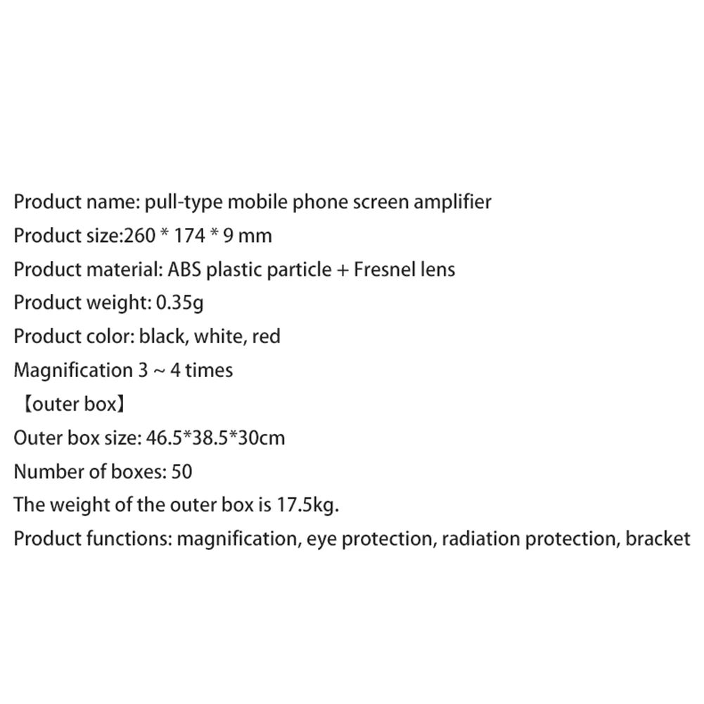 10/12 дюймовый мобильный увеличитель для экрана телефона 3D HD видео усилитель проектор Подставка Кронштейн складной телефон увеличительное стекло Настольный держательХарактеристика:1. Hd-экран: зеркальный экран Fresnel использует технологию оптического зума HD, которая может увеличивать HD в 3-4 раза, эффективно предотвращая излучение, генерируемое мобильный телефон.2. Конструкция скольжения: растяните силиконовую круглую кнопку, а затем появится экран. Этот режим скользящего экрана помогает защитить экран и более подходит для транспортировки.3. Простое управление: усилитель экрана удваивает Размер экрана, так что вы можете сделать большинство фильмов и видео на вашем HD смартфоне. Добавьте bluetooth-совместимую клавиатуру и используйте ее для воспроизведения HD.4. Высококачественные материалы: АБС-пластик и зеркало Френеля, прочные и долговечные, даже более высокая четкость. Регулируемый угол обзора. Нескользящая силиконовая накладка защищает и стабилизирует телефон.5. Отличная совместимость: независимо от того, являетесь ли вы iPhone или телефоном на базе Android, экран проектора увеличительного стекла может использоваться с вашим устройством. 3D визуальное удовольствие может избежать визуальной усталости.12 дюймов спецификация:Материал: АБС-пластик + линзы ФениксУвеличение: 3-4 разаФункции: усиление, защита глаз, защита от излучения, подставка-держательРазмер изделия: 260*175*10 мм/10,23*6,88*0,39''10 дюймов спецификация:Размеры: 25,4 см/10inМатериал: АБС + акрилНазначение: увеличение, защита глаз, защита от излученияПримечание:1. Из-за различных настроек монитора и светильник эффект, фактический цвет элемента может быть s светильник ly отличается от цвета, представленного на снимках. Спасибо!2. Возможны отклонения в 1-3 мм вследствие измерений вручную.