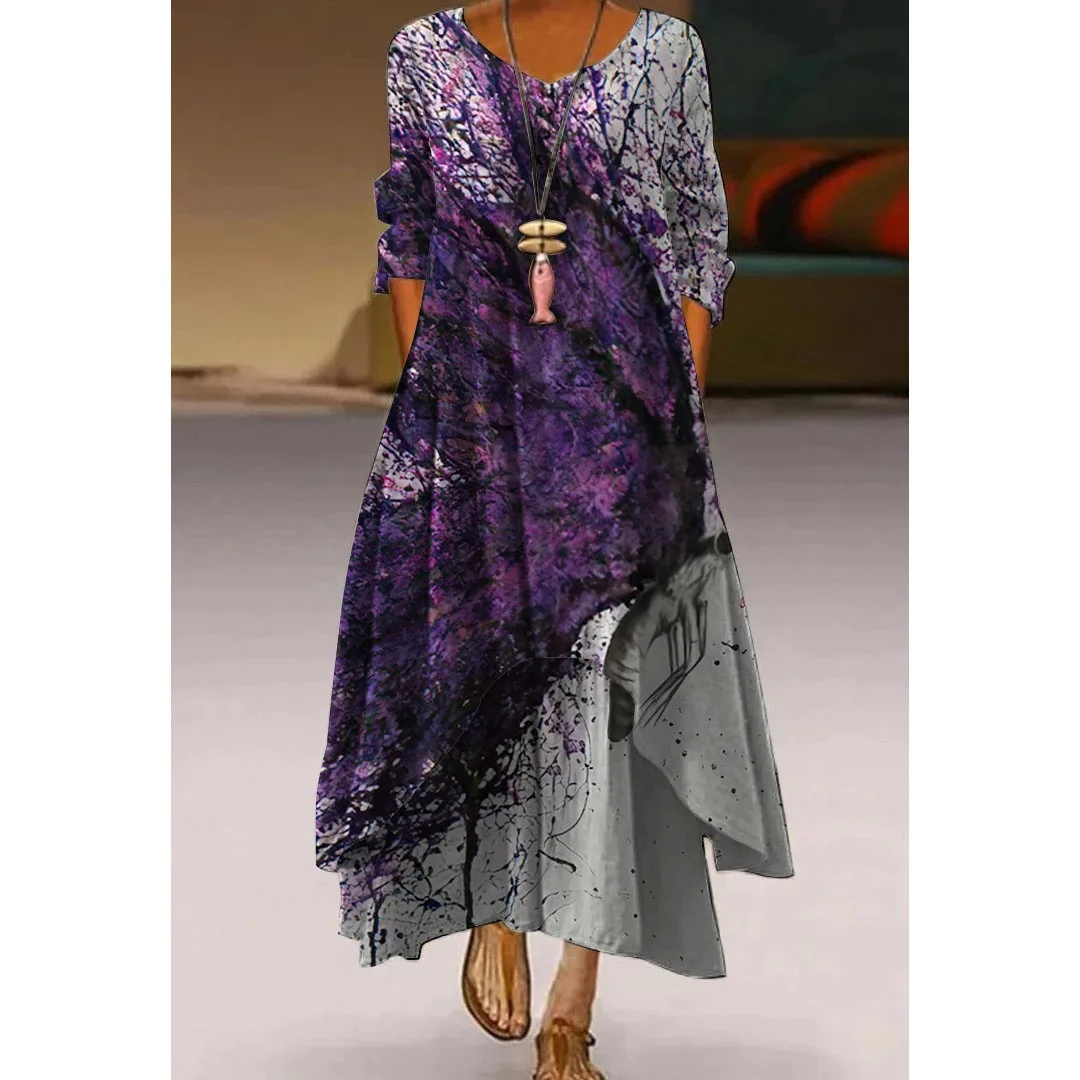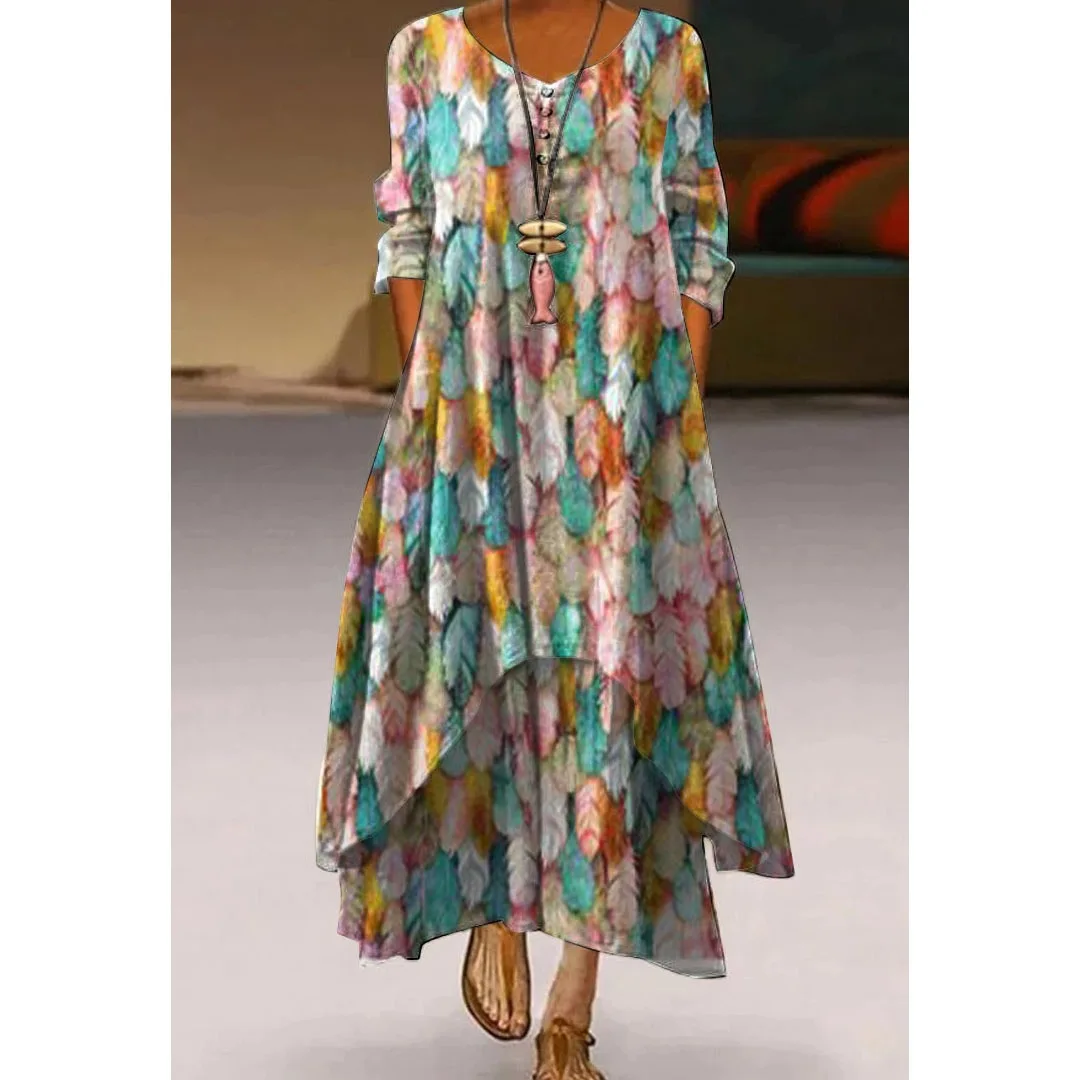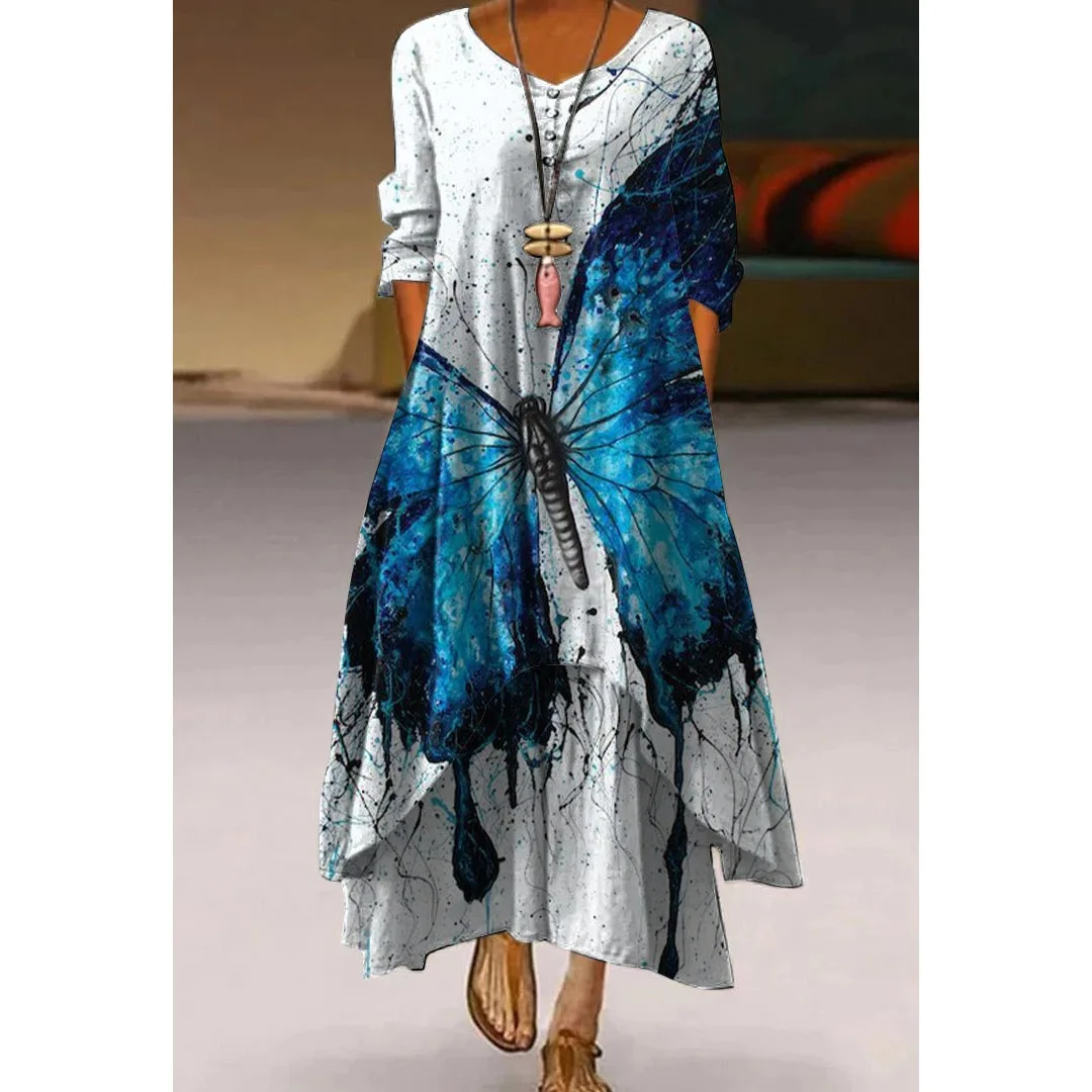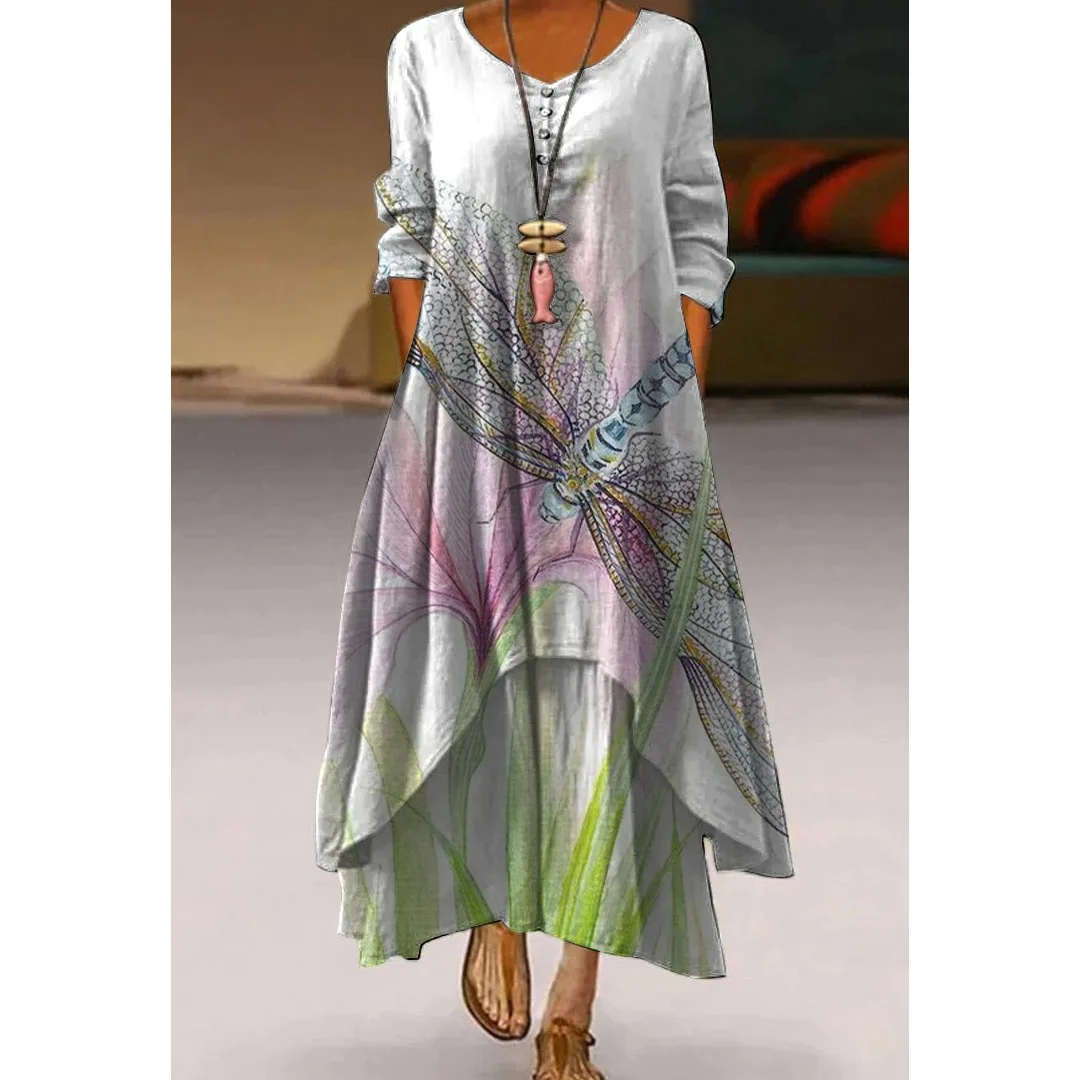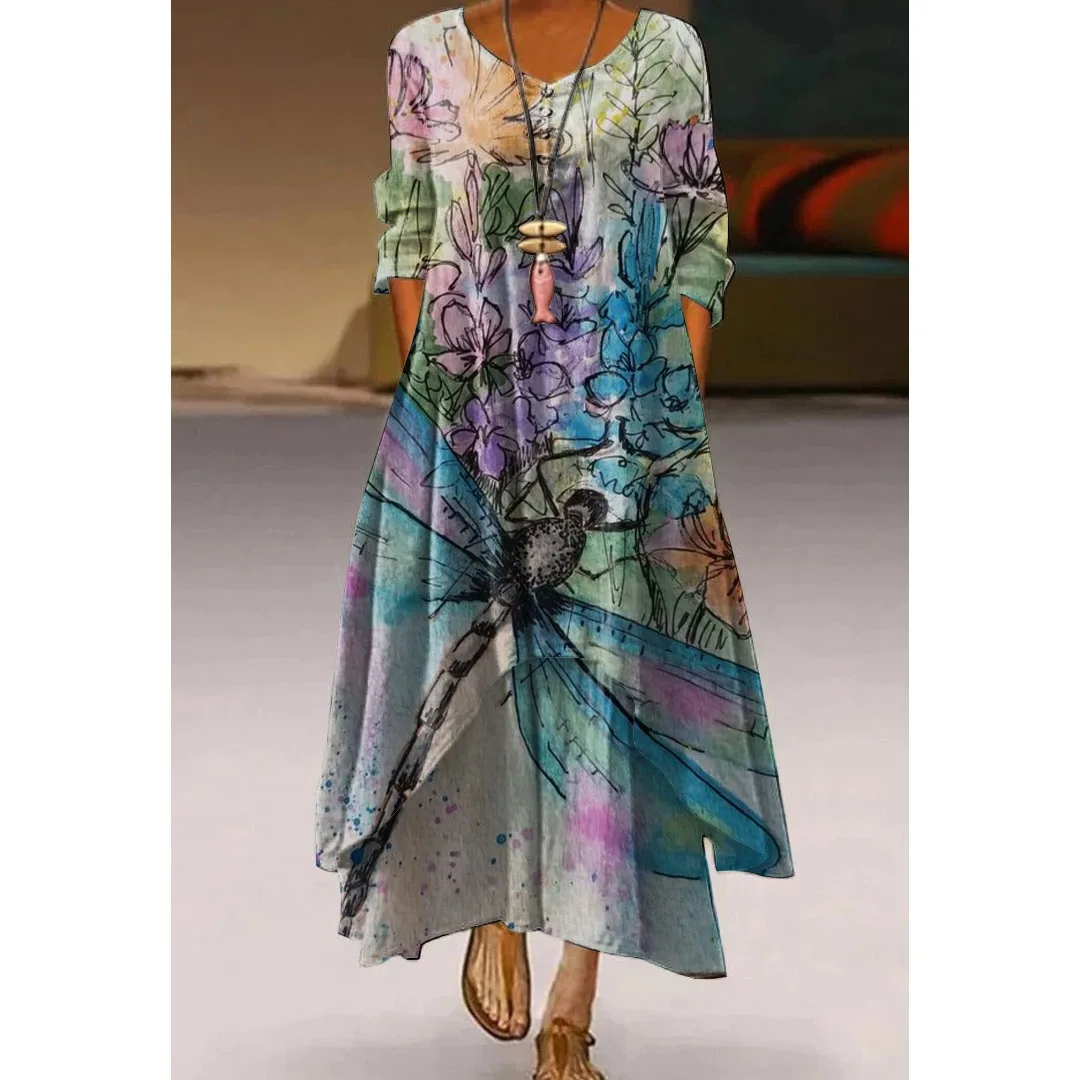 Женское платье с 3D принтом, элегантное женское платье с бабочкой и стрекозой, модное пляжное платье с длинным рукавом, V-образным вырезом и цветами в стиле бохо, праздвечерние чные платья