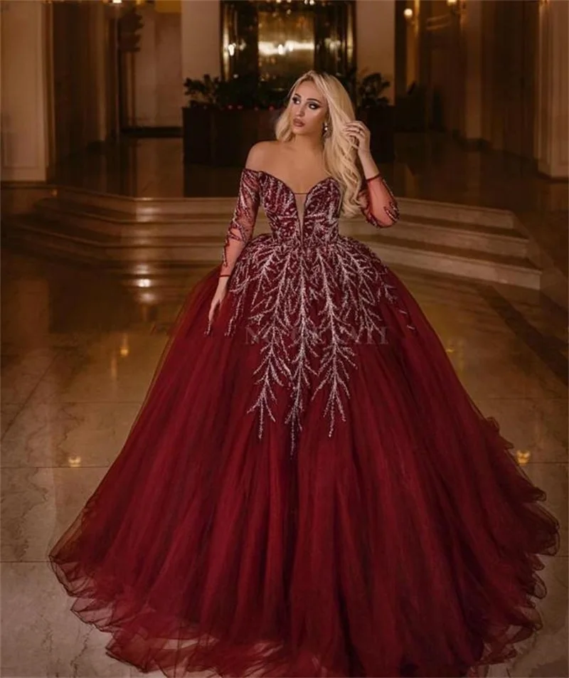 Бордовое Тюлевое Пышное вечернее платье, бальное платье с бисером и блестками, кружевные вечерние платья с длинным рукавом, женское вечернее платье