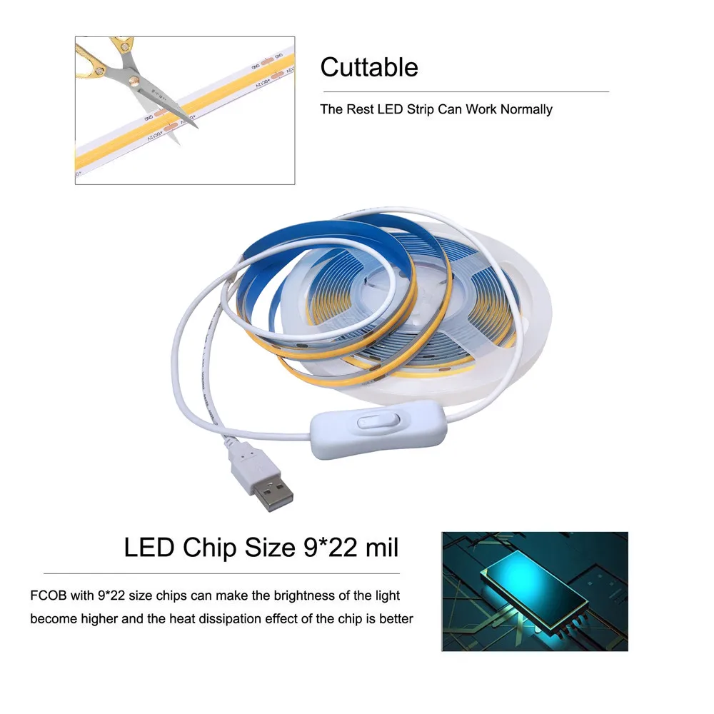 Светодиодная лента RA90 с переключателем USB, гибкая LED полоска с высокой плотностью светодиодовм, теплая естественная белая полоска, 5 в постоянного тока