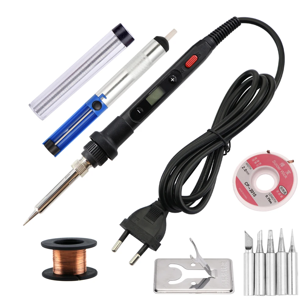 1 шт. 80 Вт ЖК-паяльник (220 В штепсельная вилка ЕС/110 В штепсельная вилка США)5 шт. наконечники паяльника (I / B / K /2.4D / 3C)1 шт. подставка для пайки из нержавеющей стали1 шт. губка1 шт. Пинцет ESD-151 шт. присоска1 шт. паяльная проволока