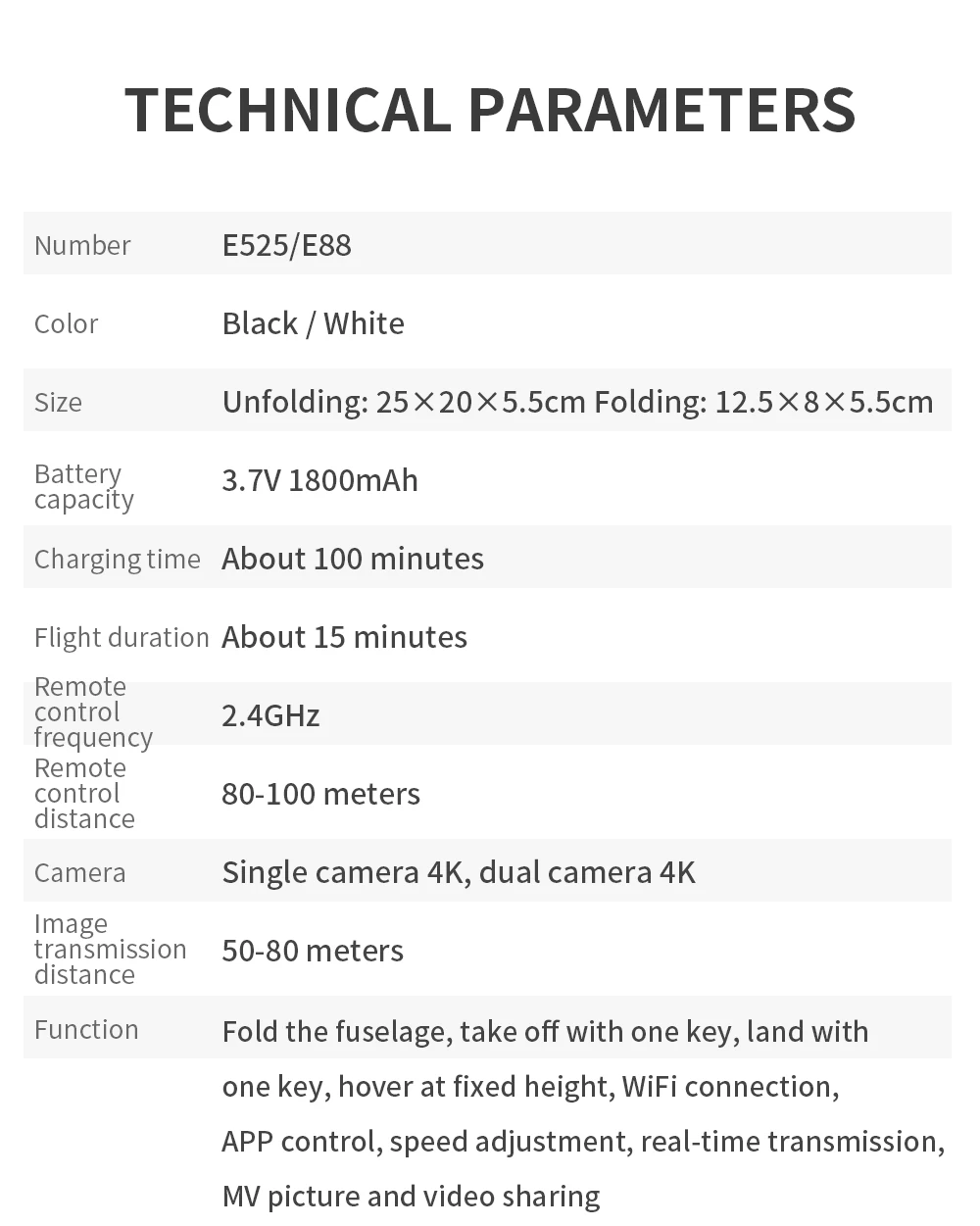Вверх/вниз, вперед/назад, поворот влево/вправо, поворот влево/вправо, бока, f светильник, 3 уровня f светильник скорость, светодиодный светильник, Безголовый режим, автоматический возврат одним нажатием кнопки, режим удержания высоты, wiFi FPV, траектория F светильник, камера/видео
