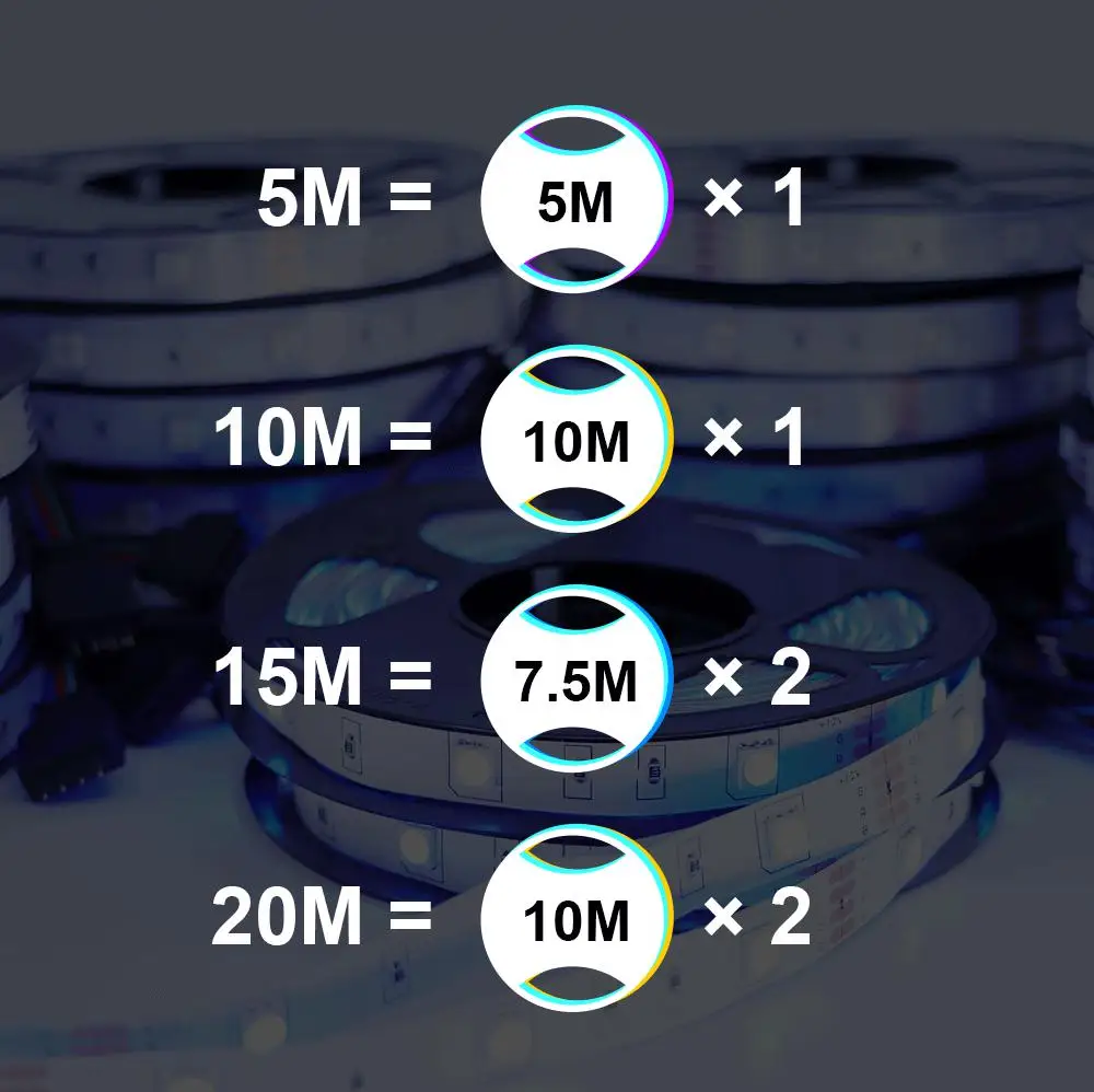 5 м = 1 рулон светодиодной ленты10 м = 1 рулон 10 м светодиодной ленты15 м = 2 рулона 7,5 м светодиодные ленты20 м = 2 рулона 10 м светодиодной лентыВозможностью погружения на глубину до 30 м = 3 roll10M светодиодной ленты
