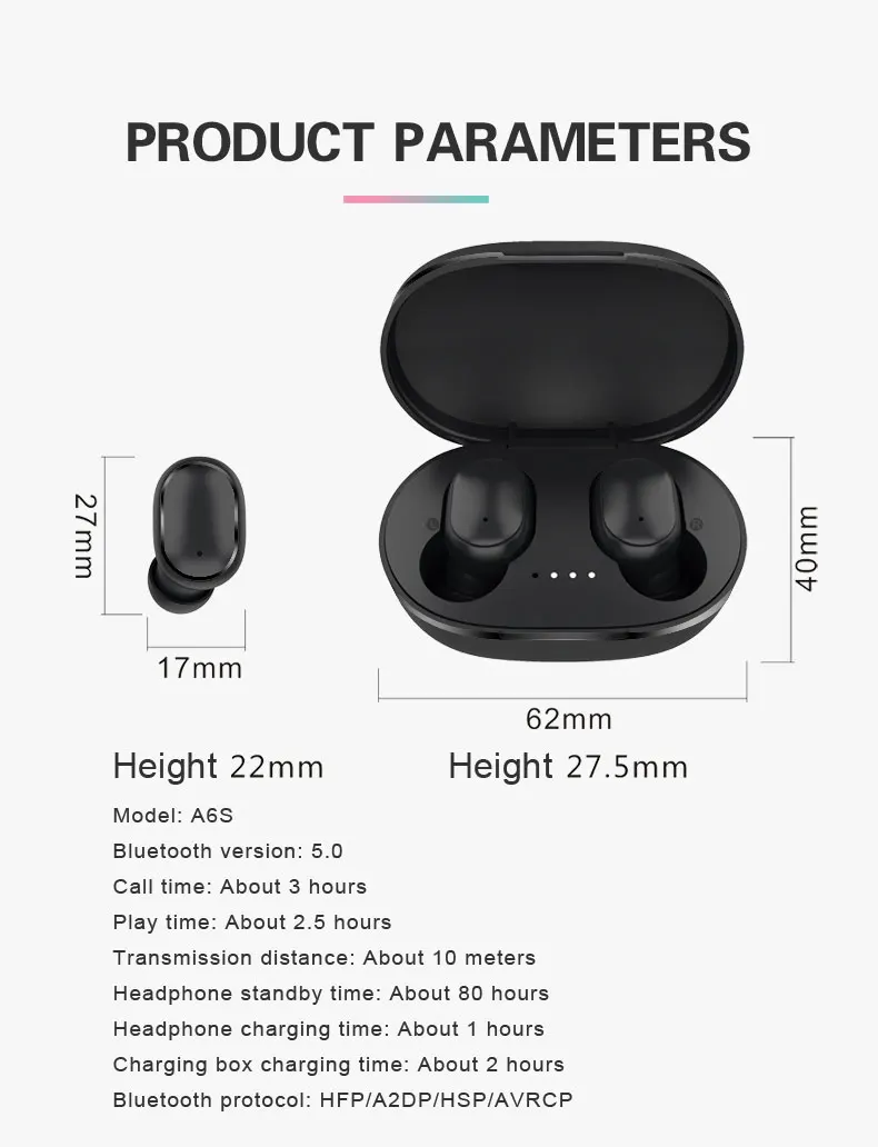 TWS-стереонаушники A6S с микрофоном и поддержкой Bluetooth 5,0
