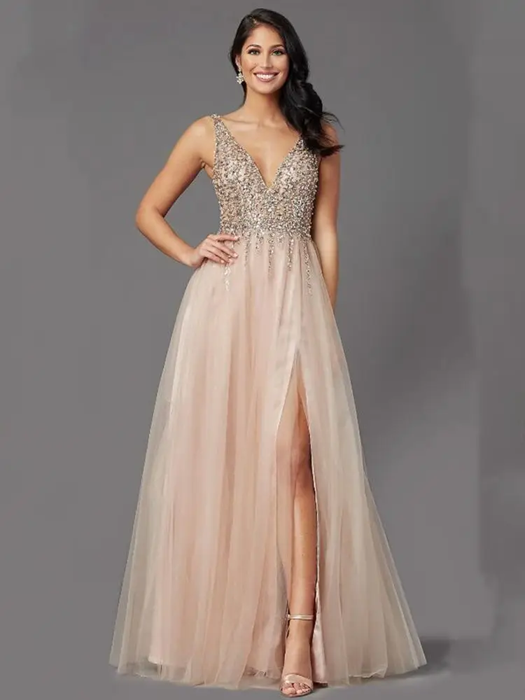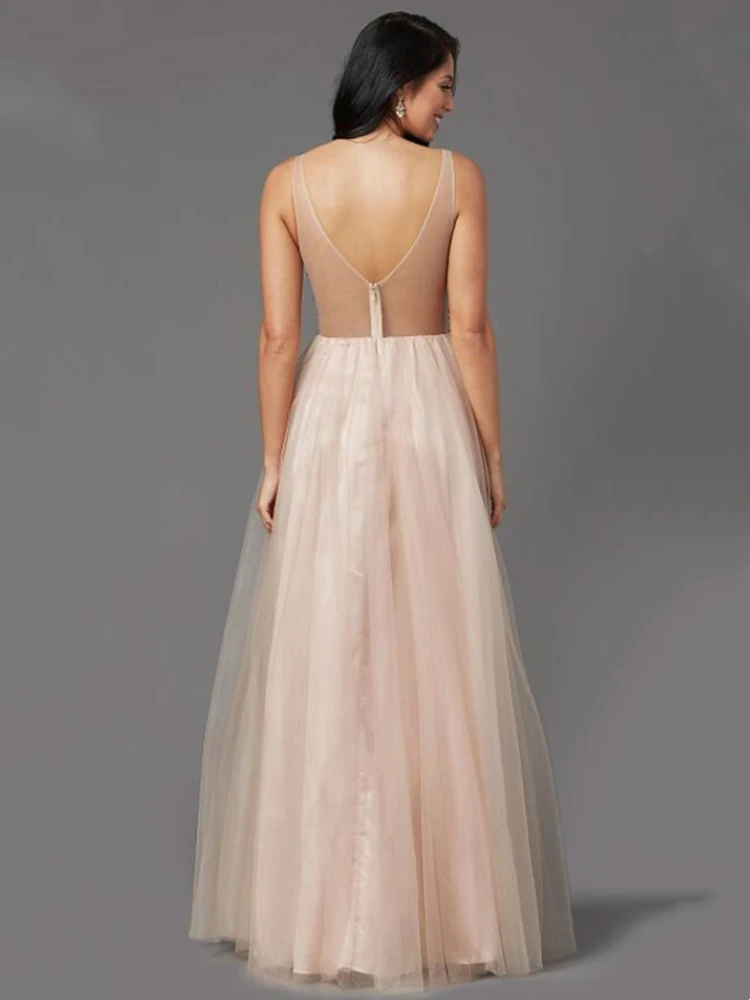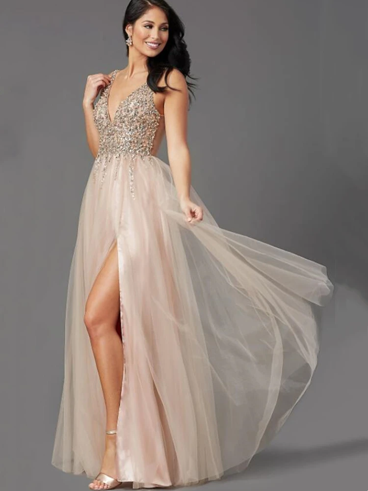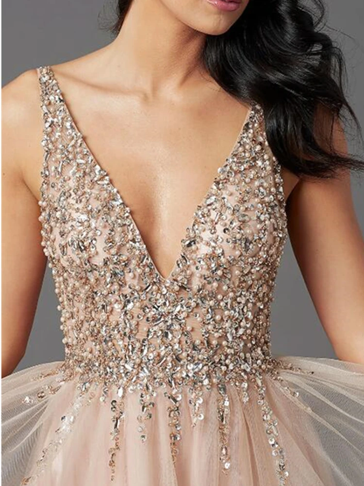 Элегантное ТРАПЕЦИЕВИДНОЕ Тюлевое платье для выпускного вечера с Стразы без рукавов с открытой спиной и V-образным вырезом для женщин вечернее платье платья для вечеринок