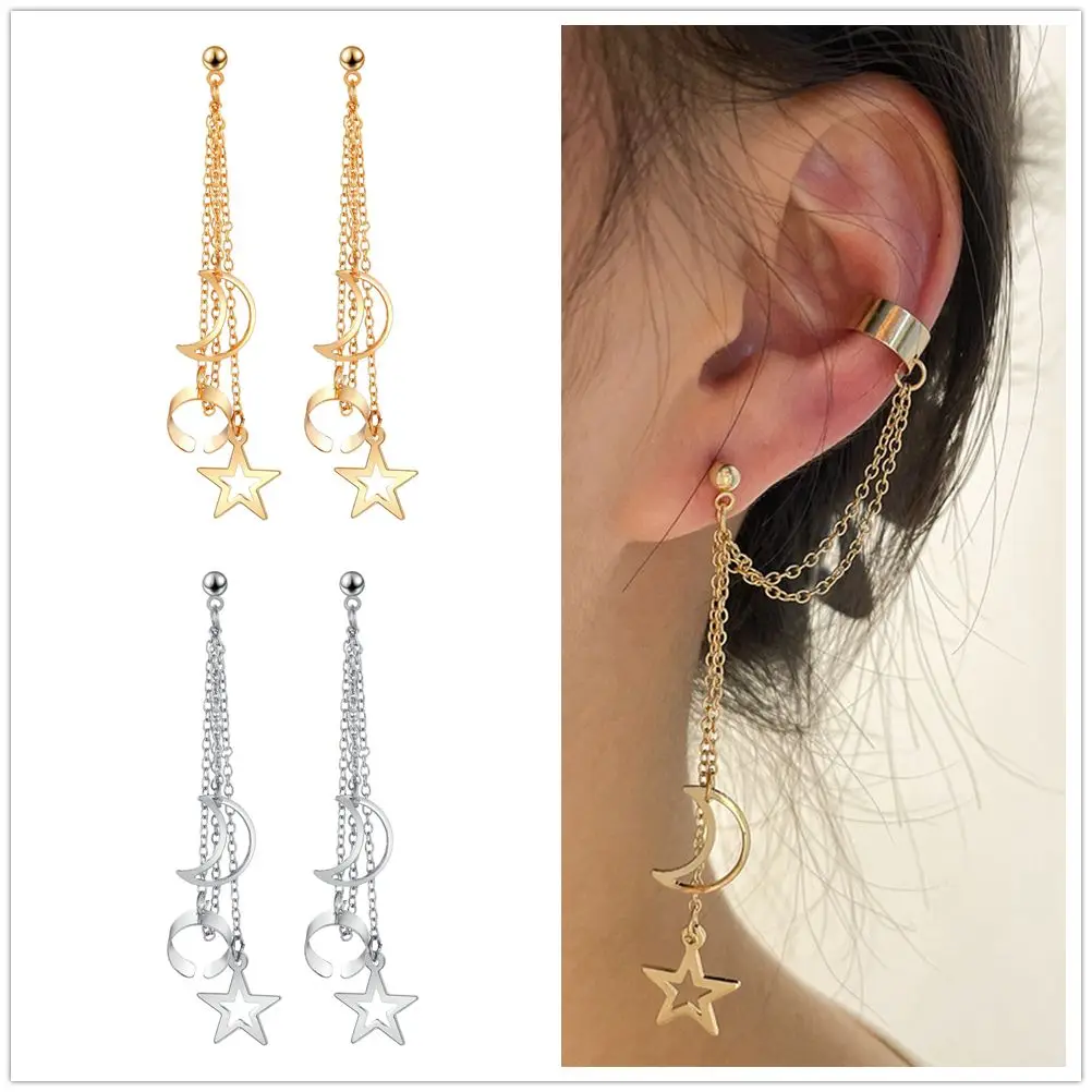 1 шт новая мода золотистого цвета Луна Звезда клип серьги для женщин Простые поддельные хрящи Длинные кисточкой серьги-каффы подарок