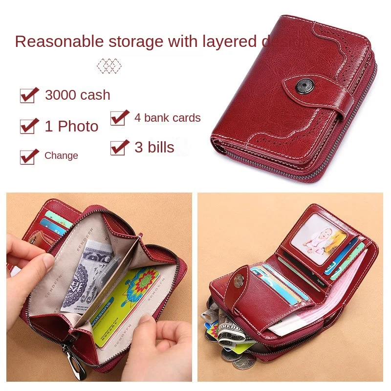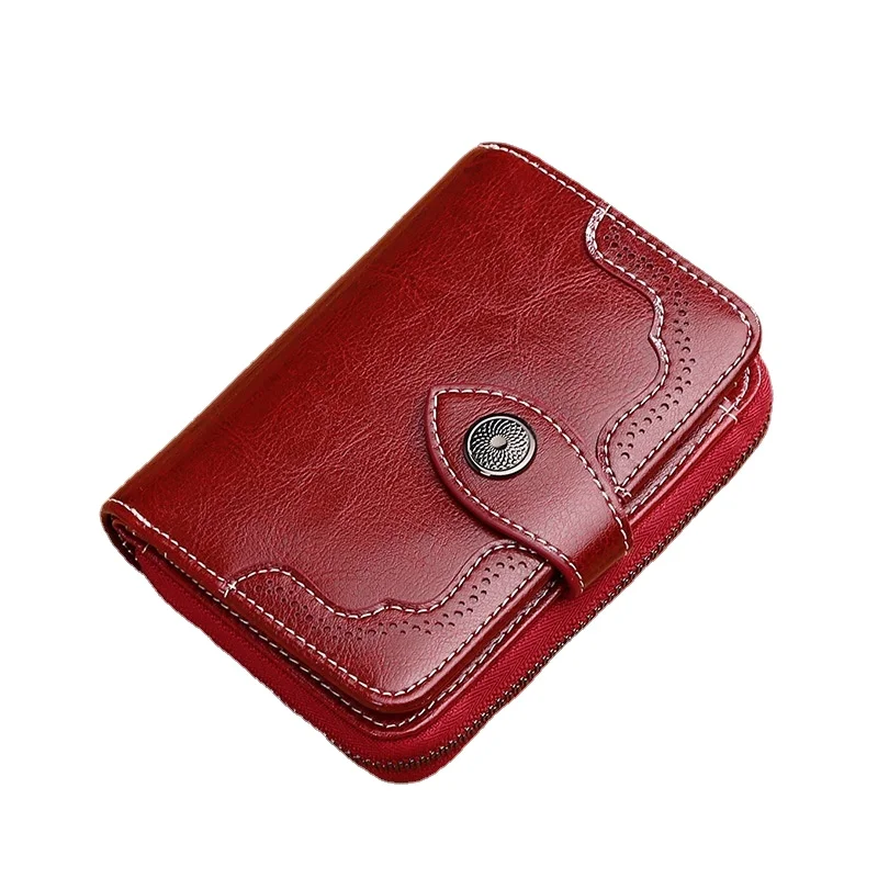 Кожаный женский короткий кошелек двойного сложения женский винтажный бумажник из вощеной воловьей кожи на молнии
