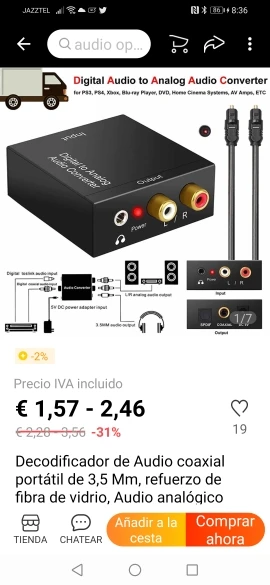 1. cor: preto2. Каркаса: металлический комплект3. Песо: aprox. 90 г4. conector de Adio de entrada: 1 x toslink, 1 x rca (коаксиальный)5. conector de Adio de saida: 2 x rca (r/l), 1 conector de 3,5 мм6. alimentado por cabo de alimentaçao usb de 5,5 ммИмеет: 0,5 Вт (máx.)8. Размеры: номер