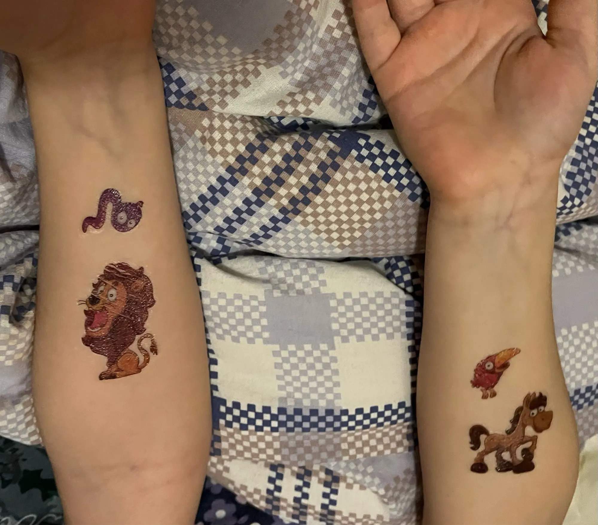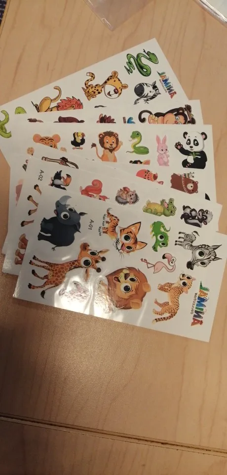 Тату симпатичные, их много, недорогие. Однако очень нестойкие. Если утром сделать, то этим же днем картинки уже все облезлые (смотрите две мои фотки). Зато остатки тату легко стираются - спиртовой салфеткой пару раз провести и всё. Моя дочка любит тату, часто покупаем, и я точно могу сказать, что обычно тату более стойкие бывают, пару дней держатся в приглядном виде, но только не эти.