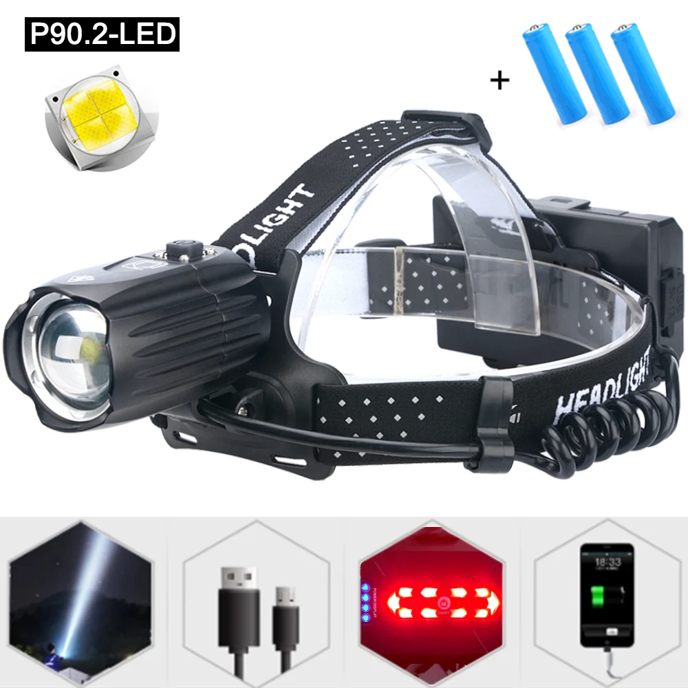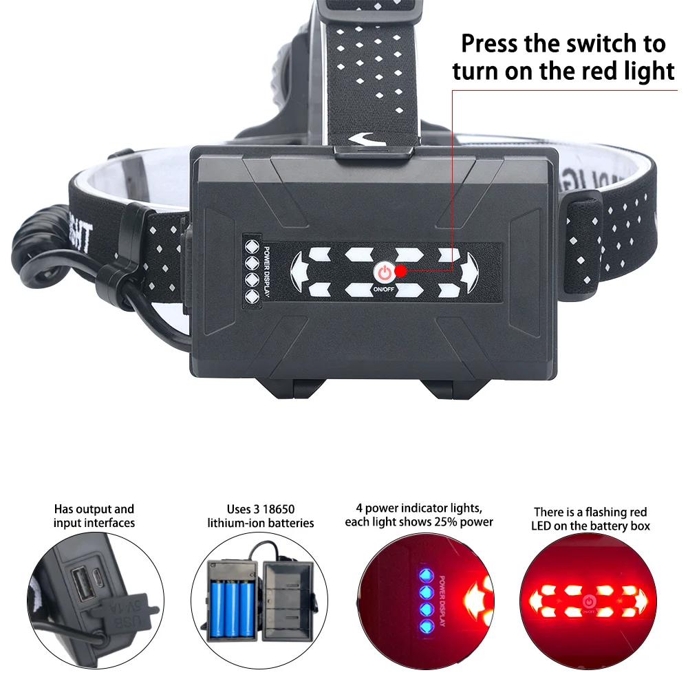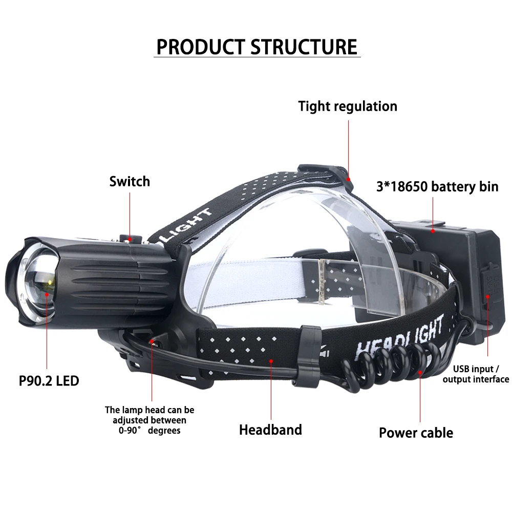 Лампа P90.2, фактическая яркость может достигать 2500 люменовОбрабатывающий центр резное мастерство, сегментированный ток, легкое рассеивание теплаОбъектив, Большая диафрагма, широкий диапазон освещенияФункция ввода и вывода батарейного отсека, может использоваться как мобильный Банк питания, отсек для батарей с дисплеем питания, 4 светодиодный индикатор, каждый светодиодный индикатор с 25% счетчиком мощностиРемень для фар добавляет нескользящий ремень, который не скользит и удобен, без ощущения давления