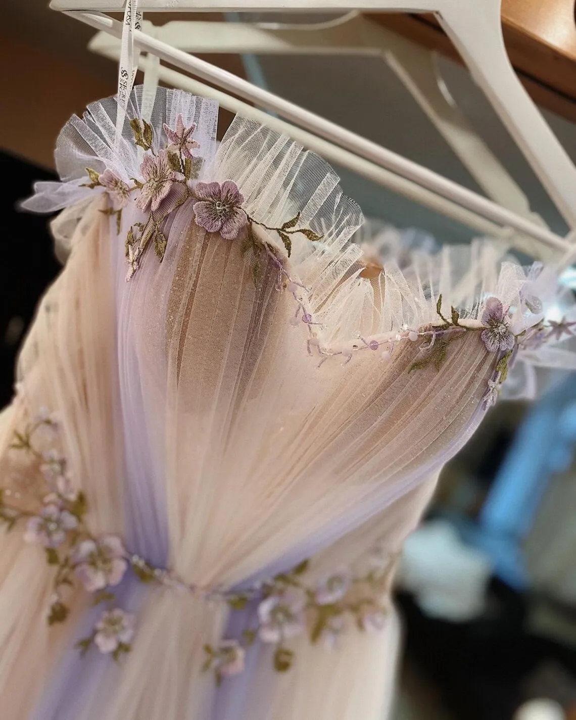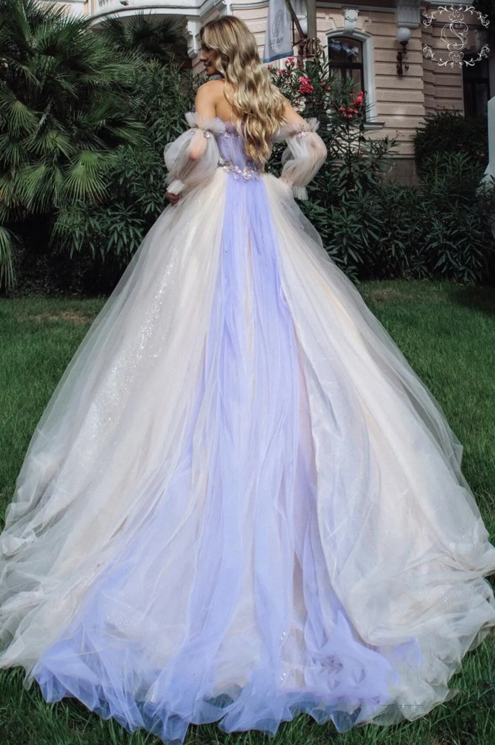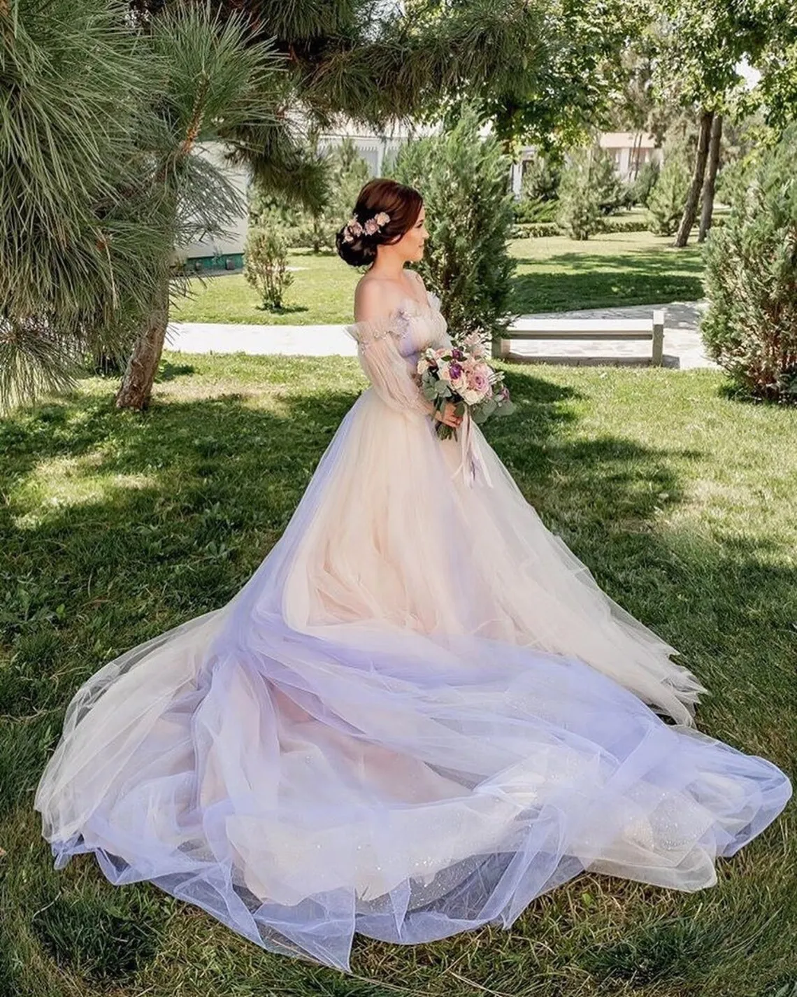 Длинные вечерние платья с открытыми плечами и оборками, Цветочное платье, светло-Фиолетовое Тюлевое платье с длинным рукавом, женское вечернее платье, свадебное платье