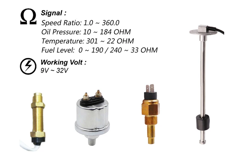 Fuel уровень топлива: 0-100%(Нажмите кнопку «назад», чтобы настроитьСигнал уровня: 0-190 Ом/240-33 Ом в наличии.)Температурная температура воды: 40-120 ℃/100-250 ℃(Датчик температуры: 301-22ohm)※ Температура воды отображается по умолчанию.Если вам нужна Температура масла,Пожалуйста, свяжитесь с нами для настройки.➽ Давление масла: 0-10 бар/0-145psi(Датчик давления: 10-184ohm)(После включения, нажмите кнопку «назад» для регулировки блока, если блок давления масла «psi'', блок температуры будет «℉».)Аналоговый вольтметр: 9-32 В➤ Полных часов двигателя: 0,0-99999,9 H(Нажмите кнопку «назад» для настройки.)Дистанционный Тахометр: 0-9999 об/минКоэффициент скорости: 1,0-360,0; Значение шага: 0,1